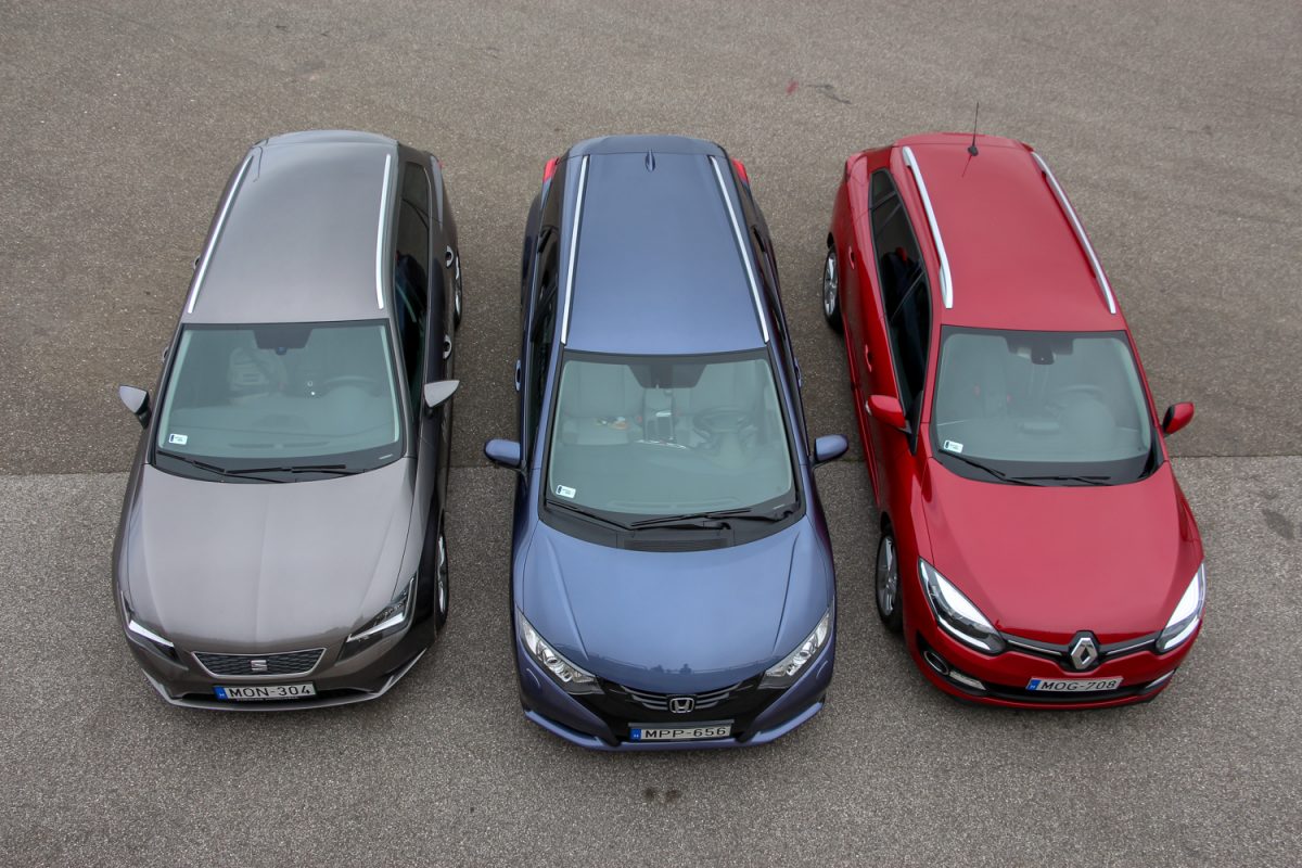 Földhözragadt emberként én az autóválasztást is az árlisták vizsgálatával kezdem, a nálunk járt Renault Mégane 1.6 dCi F1-technikás, a trió legerősebb és legnyomatékosabb, így a legjobb menetdinamikát adó motorjával és leggazdagabb felszereltségével is a trió legolcsóbbja. Egyedül ebben van kulcs nélküli nyitás és indítás, és hiába ez a legkorosabb modell, formája jól tartja magát, utastere egészen gusztusos. Azon pedig nem kell fennakadni, hogy csomagtere „csak” 491 literes, így is óriási. Az üléshajtáskor azért meglátszik, hogy ez egy olcsó autó, a láthatatlan helyeken nincs masszív anyagminőség. Üléshajtásban egyértelműen a Honda a nyerő, de a SEAT sem rossz, utóbbi ráadásul nyerte az isofixes gyerekülés-behelyezési versenyt, ott ugyanis külön műanyagházakban, jól elérhető helyen kínálkoznak a csatlakozók, nem pedig a támla és az ülőlap tövében, nehezen elérhetően.
