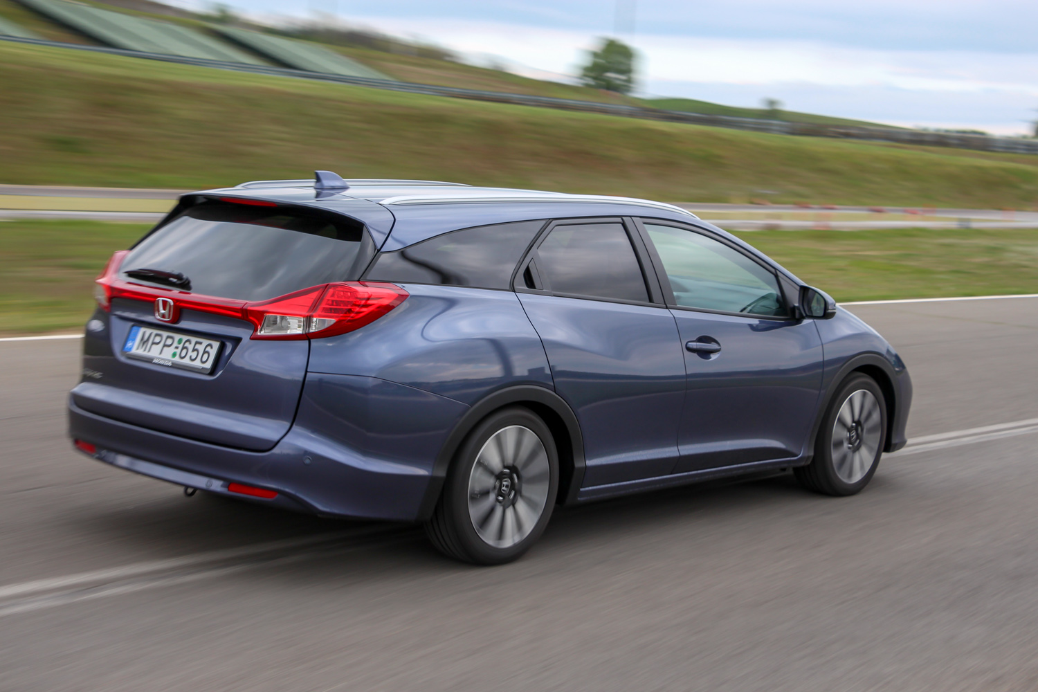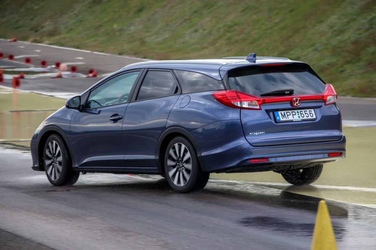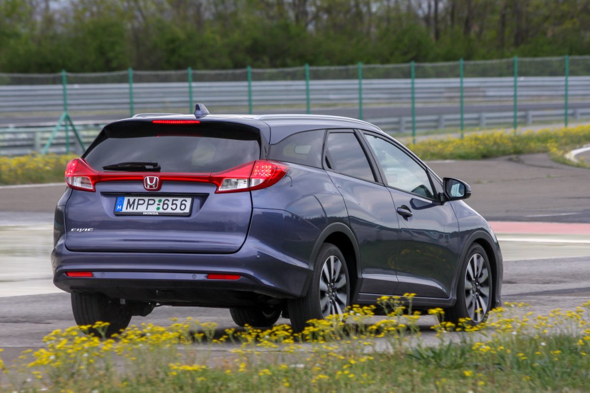 A Leon ST picit laposabb, és hátsó lámpája is lehet LED-es. A Civic Tourer "rejtett" hátsó kilincses, s ha szélvédőjét nem is osztja keresztgerenda, mint a ferdehátúnál, a lámpákat csak "összekötötték" a tervezők... Az autókat 17-es kerékkel és nyári gumival kaptuk a Mégane-on 205/50, a többieknél 225/45-ös méretben