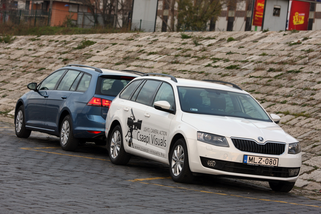 Külön-külön is teszteltük őket, de egy összehasonlítás szintén adta magát. Annyit "csaltunk", hogy míg a korábbi cikket egy importőri Octavia Combiról írtuk, addig a videóban és ezeken a képeken operatőrünk saját Skodája szerepel. Ami mondjuk ugyanúgy 140 lovas 1.4 TSI benzines és kéziváltós, mint a tesztautó volt. A VW Golf Variantot 105 lovas 1.6-os dízelként próbáltuk szintúgy manuális váltóval