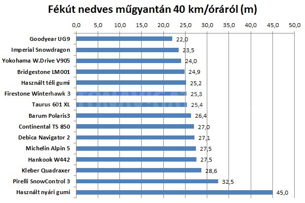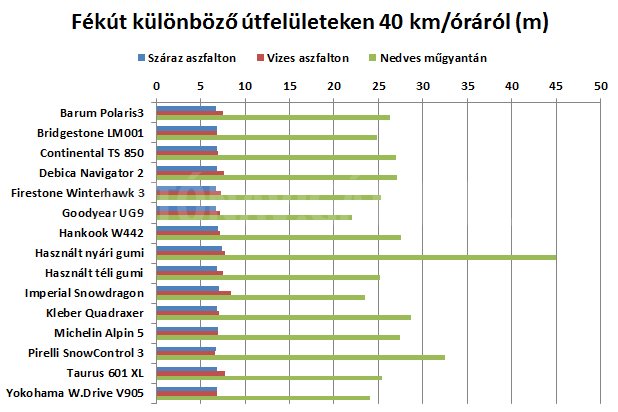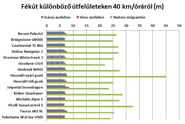Nincs olyan gumi, ami mindenhol jó lenne, komoly különbségek a legnagyobb fékutat adó nedves műgyantán adódtak. Az ábrából jól látható, hogy utóbbin mennyivel nagyobb fékút szükséges már 40 km/órás tempóról is