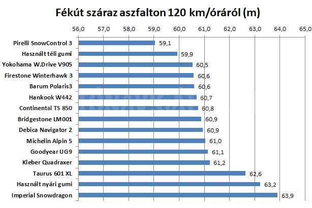 Jól látható, hogy száraz és nedves úton nincsenek vészesen komoly különbségek a gumik között, de azért a legjobb és a legrosszabb között száraz aszfalton is csaknem 5 méter a fékút-különbség 120 km/óráról. Ahol a legjobb Pirellivel már állt az autó, ott az utolsóként vizsgázóval még 34 km/órával robogott. Meglepően jól szerepelt, a második legjobb száraz úton fékezhetőséget adta a használt téli gumi, ám ez inkább az adott modell erényének tudható be, hangsúlyosabb, hogy a kínai Imperial Snowdragon az utolsó, a nyári gumi pedig már fagypont felett is rosszabbul vizsgázott, mint a téliek vagy akár a négyévszakosak.