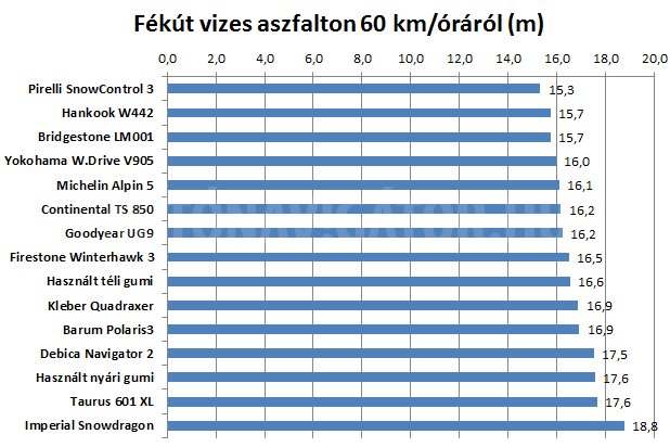 A folyamatosan locsolt, egységesen vizes aszfalton mért fékút sem mutatott komoly különbségeket, a mezőny kétharmada jól vizsgázott a fagypont közeli teszten. De a kínai Imperial itt is 3,5 méterrel nagyobb fékutat adott az itt legjobb Pirellihez mérten