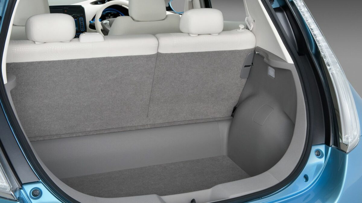 Újonnan jól mutatott, ám látványosan tud öregedni az első Leaf beltere. Csomagtere 370 literes