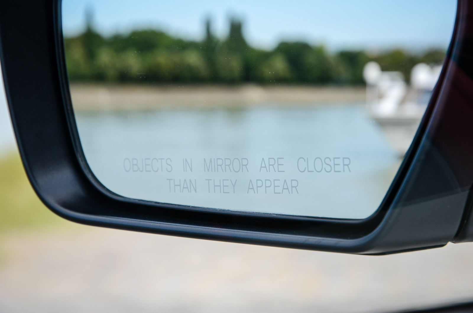 Szerintem a külső visszapillantó szövege azt emeli ki, hogy a benne látható tárgyak KÖZELEBB vannak, mint amilyennek látszanak.