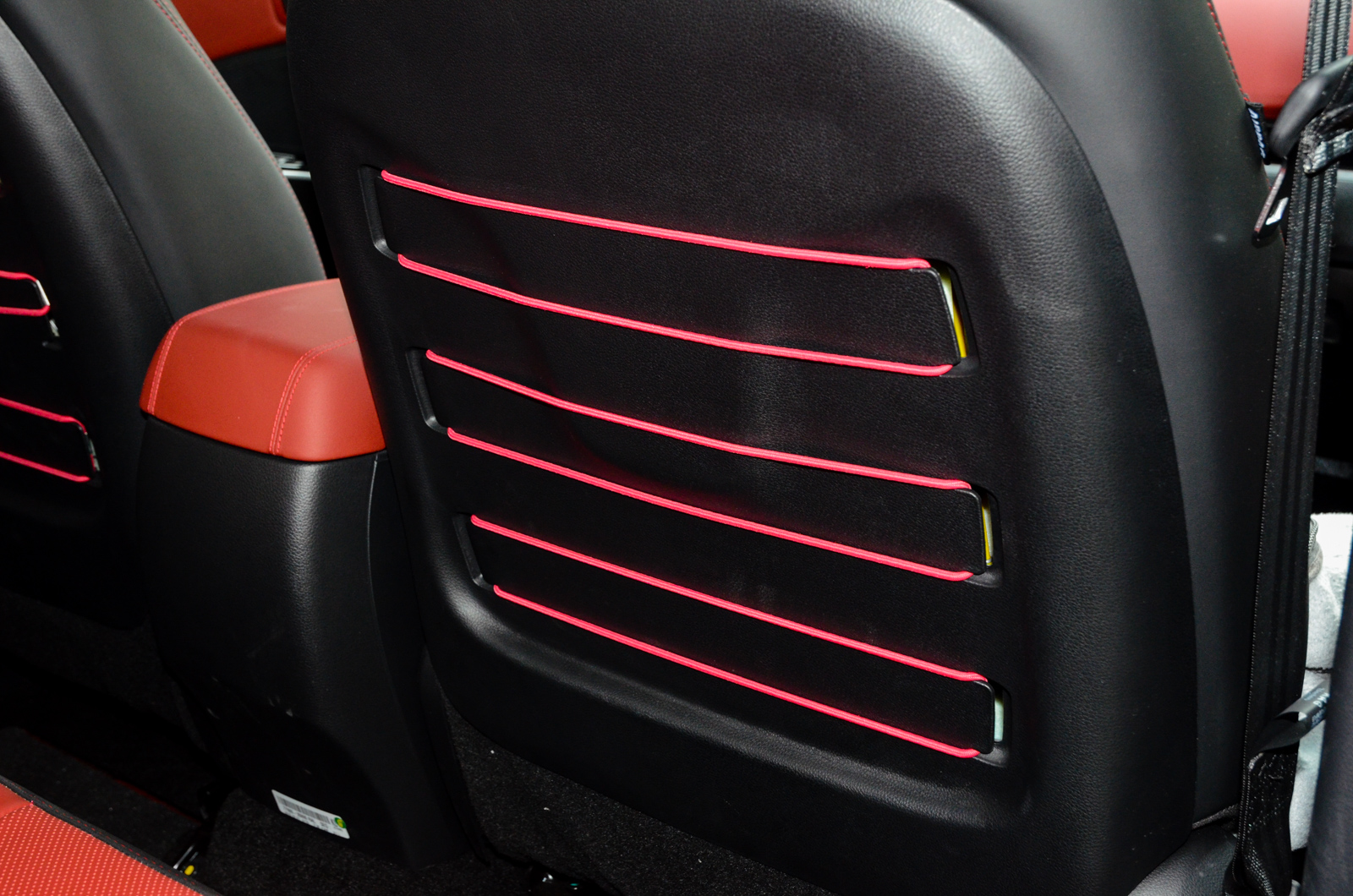 Az ajtóban lévő tárolórekeszek méretesek. 1 literes palackok mellett további tárgyakat is elhelyezhetünk bennük. Az ülések, a kormány és műszerfal mellett az ajtókárpitnál is megjelenik a piros szín