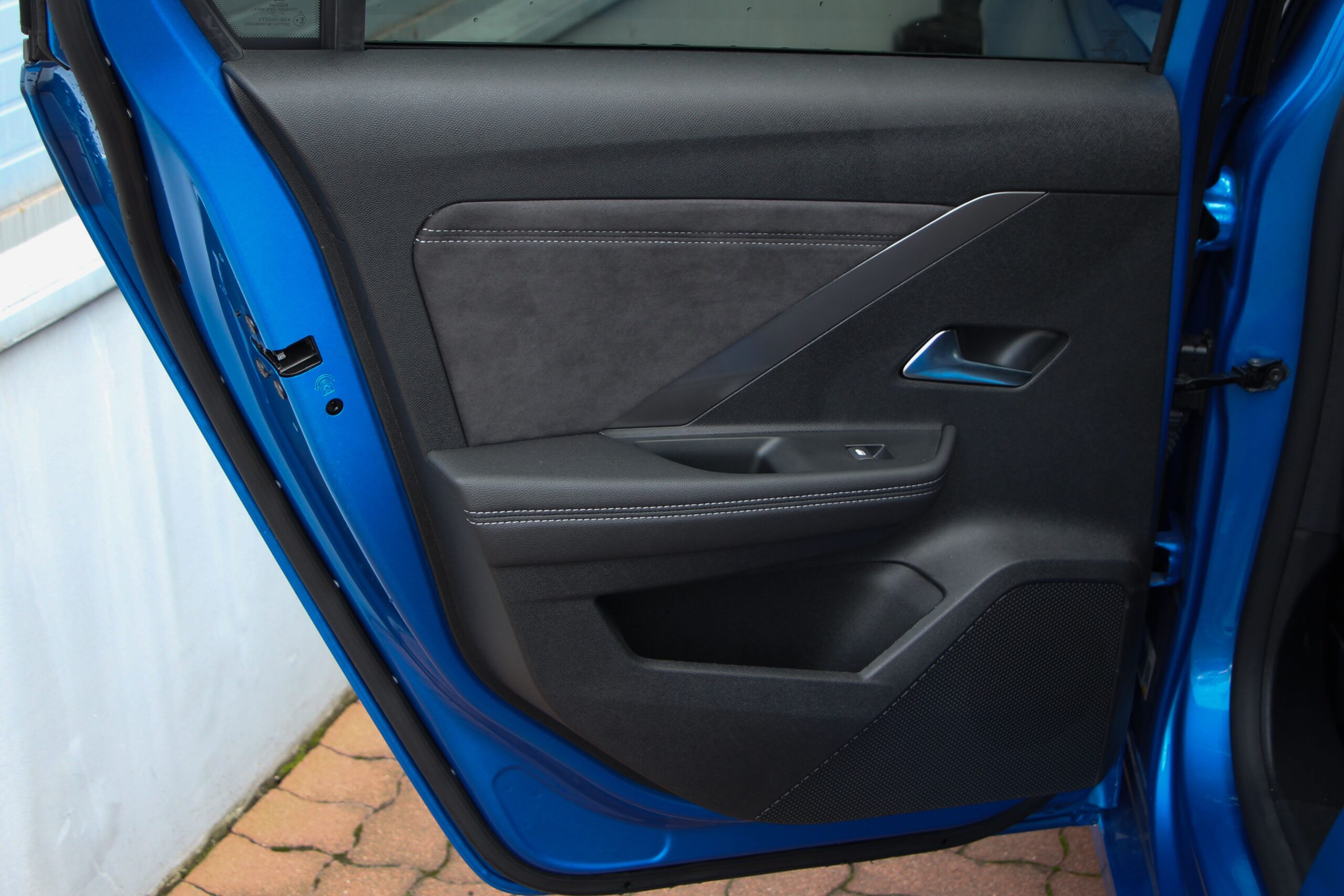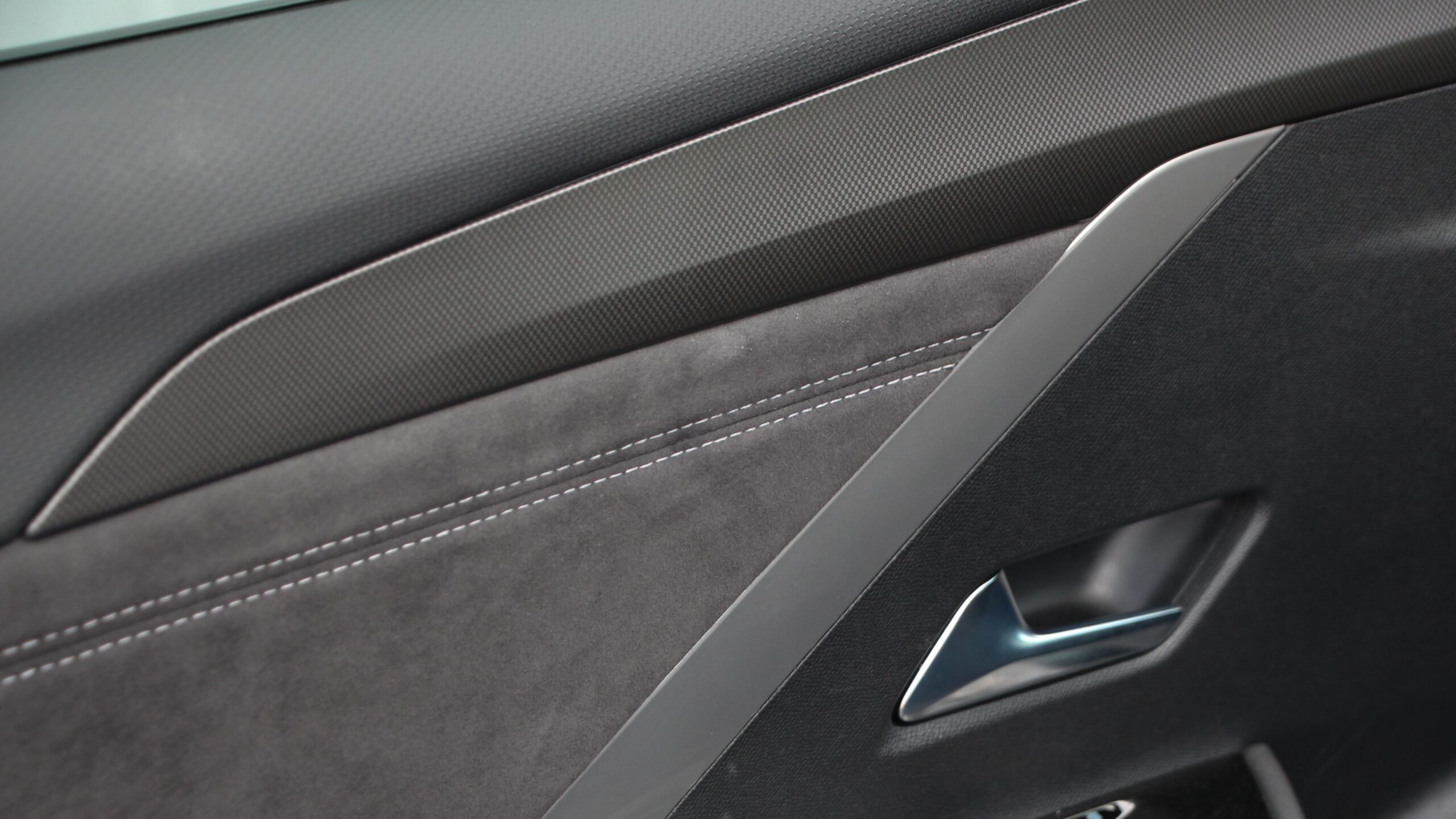 Azt pedig, hogy konnektoros hibriddel van dolgunk, nem sok részlet árulja el. Itthon természetesen a zöld, Németországban az E-betűre végződő rendszám, de a plusz egy tanksapka nem feltűnő. Az utastérben sincs különösebb nyoma, hiszen nincs külön gombja mondjuk a tisztán villanyhajtásnak, azt is az üzemmódválasztóval aktiválhatjuk. A műszerfal is ugyanolyan baltával faragott stílusú, mint a külső formaterv, de így megvan az összhang. Sok a zongoralakk, ami ismét csak megosztó vonás, mindenesetre elegáns megoldás. A kormány nem sportosabb a GS Line-ban a többi modellhez képest, de ez nem baj, kiváló a fogása, mögötte ott a 10 colos digitális műszeregység, ami egy panelt alkot a központi érintőkijelzővel. Az ergonómia jeles, nagyon egyszerűen kezelhető minden, és fizikai gombokat kapott a klíma, ami manapság már szinte "örvendetes konzervatívságnak" nevezhető. Ami viszont szöget ütött a fejembe, az az ajtóburkolatok kialakítása. Itt is nagyrészt igényes, puha anyagokkal találkozunk, kivéve ott, ahol a legtöbbször érünk hozzá, nevezetesen a kilincs körül. Mert ott az egész autó legolcsóbb hatású, durván kopogós műanyagját alkalmazták, ami számomra érthetetlen. Persze ez csak szőrszálhasogatás, mert nem nagyon fog izgatni, amikor az AGR tanúsítványos, (mű)bőr-Alcantara ülésekbe süppedünk.