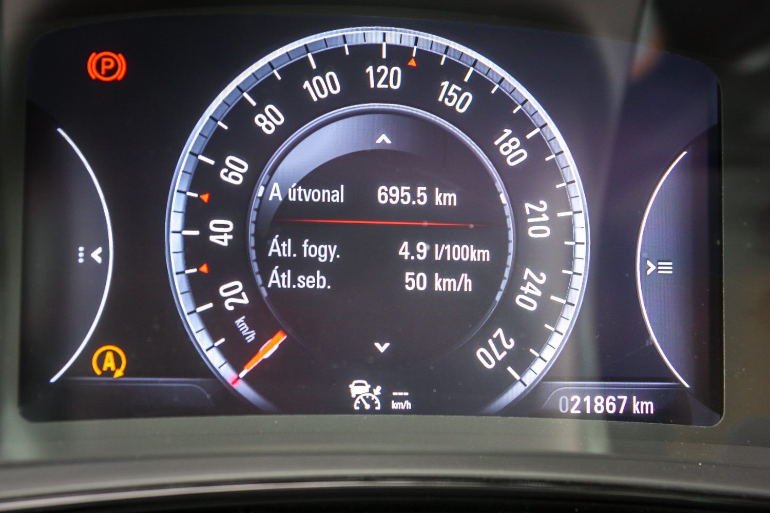 És még tompító Eco-mód egy-egy előzéssel, a gyorsabbak elengedése, kényelmes andalgás, a tájnak, a békének az ő élvezése. Fordulat 2000 alatt szinte végig, jellemzően 1500 környékén, sőt. Viszont a pillanatnyi fogyasztásmérőt nem bámultam, hogy aztán a tesztautó leadása előtt öntse el kis szívemet az elégedettség: ez az 1,8 tonnás, brutálisan nehéz valami képes ám 5 literes fogyasztásra is. Így, ilyen használattal. A fedélzetin 4,9-es érték szerepelt (50 km/órás átlagsebességgel), a visszatankolásnál kerek ötös jött ki. Ez alapján szerintem reálisan 6-tal el lehet közlekedgetni egy ilyen 140 lovas dízel Insigniával, ami nem kimagasló, de a túlsúlyossághoz képest baráti.