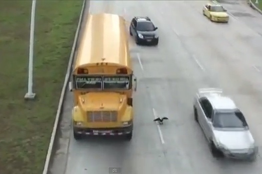 Nem tudjuk, hogy mi lehetett annyira fontos a videón látható madárnak, hogy élete kockáztatásával áttotyogjon az ötsávos úton, sem azt, hogy vajon miért nem választotta a rendelkezésére álló eszköztárból a repülés képességét, mindenesetre úgy döntött, ő halált megvető bátorságról és teljes idiotizmusról tanúbizonyságot téve inkább átsétál az elszáguldó autók között. Vagy őrangyal vigyáz rá, vagy tényleg Jedi-ereje van, mindenesetre ha így átjutott négy és fél sávon, akkor reméljük, hogy az utolsó pár centin is biztonságban végig tudott haladni. Mindenesetre ilyen hidegvérű meleg vérű állatot még nem láttunk...