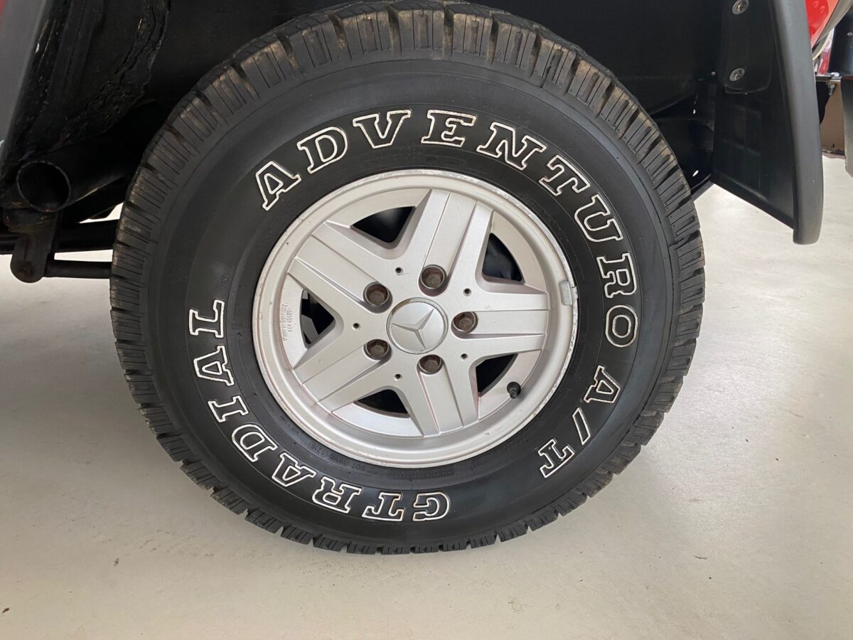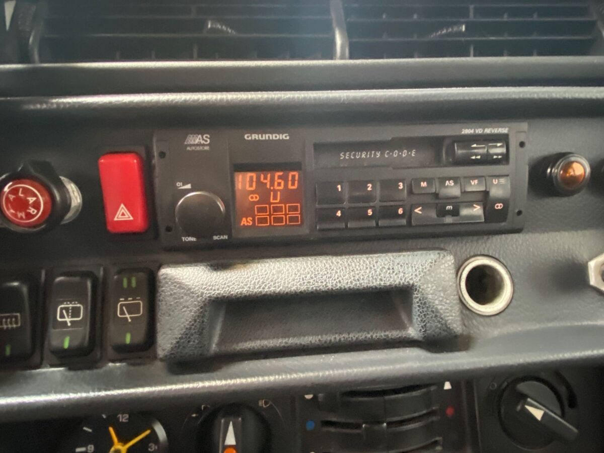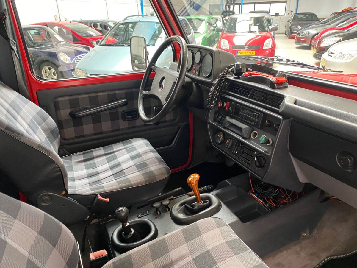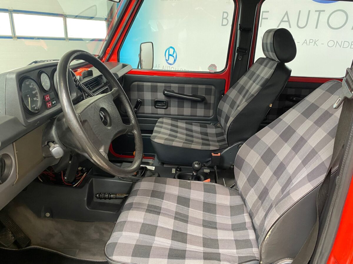 Kézi váltós munkagép, zárható differenciálművekkel és felezőáttétellel. A nyolcvanas évek Mercedeseire jellemző kormánykerékkel és kockás üléskárpittal (Fotó: baafautomotive.nl)