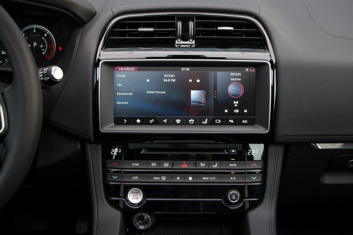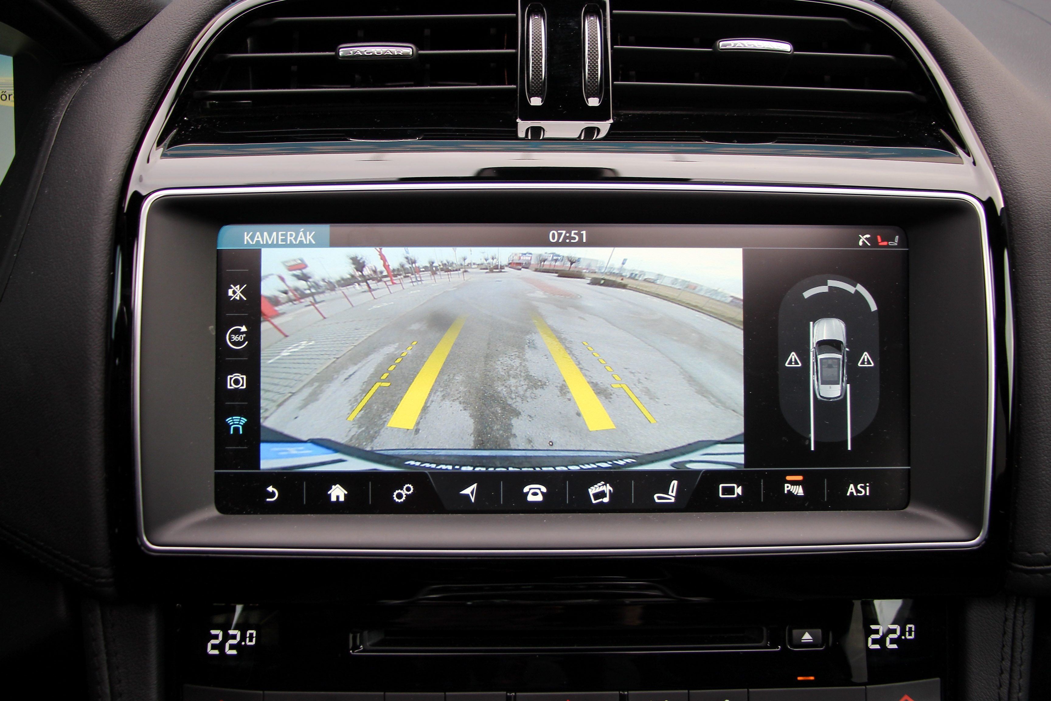 Képtelenségek. A harmadik Jaguar – Land Rover tesztautó után már beletörődtem, hogy a kézzel varrott bőr exkluzív, viszont nem szép, így ehhez mértem a belteret, ami anyagaiban remek és egész jól összerakott. A feláras Windsor bőrkárpit elég retro, de megállja a helyét egy Jaguarban, az ülés összes dimenziójában elektromosan állítható, fűtése-hűtése macerásan a kijelzőről állítandó, de egészen szokható. A 10,2 colos InControl Touch nevű rendszert futtató középkonzolt lehet szeretni, jól néz ki, szép a képe és matt is, legtöbbször gyors, számomra egész egyértelmű a kezelése. Macera az indításnál van vele, ha nem számítom, hogy az első indulásnál 10 perc után sikerült életre kelteni, akkor is zavaró, hogy minden indulásnál először rá kell bökni, hogy bejöjjön a kép (ezt ki is írja). Ha nem várjuk meg, míg feláll a rendszer, és úgy „tekerjük” a hátramenetet, akkor a kamera képe csak kicsiben jelenik meg és nem lehet átváltani más nézetre, így kezdhetjük elölről, bármennyire sietnénk. Mert azért jól jön a kamera, bárhol legyünk vele.