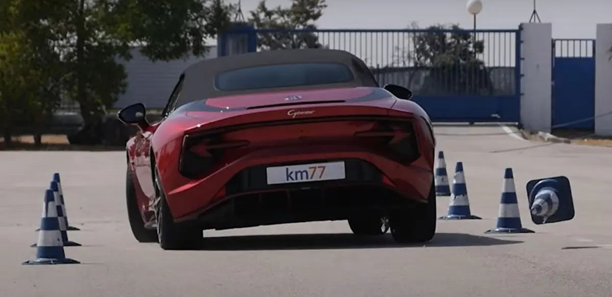 Kikerülés: 76 km/h tempónál a bóják között marad, a viselkedése nem tűnik idegesnek, a felborított bója inkább a sofőr hibájának tűnik, nem az autóé. Már csak azért is, mert 79 km/h bemeneti sebességnél minden bója állva maradt és ugyanolyan stabilan mozgott a Cyberster. 81 km/h-nál már látszik egy kis megbicsaklás, de mégekkor is bőven uralható marad a gép. Aztán 82 km/h tempónál már letarolja a bójákat, de itt ismét a sofőr hibájának tűnik, hiszen összességében az autó nem akar kitörni, egyszerűen csak a vezető rossz íven tartja.