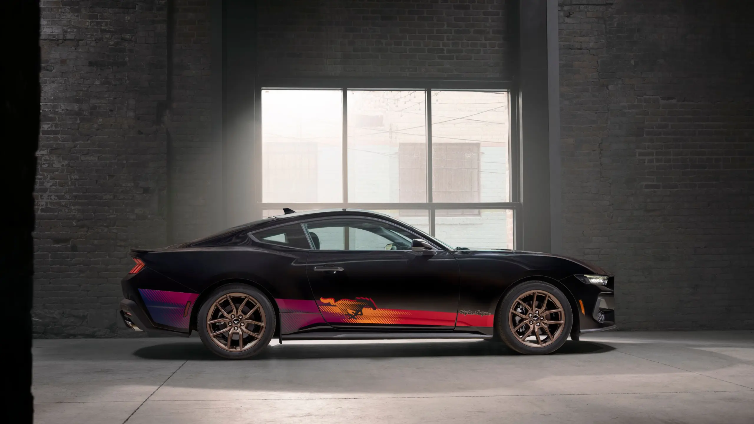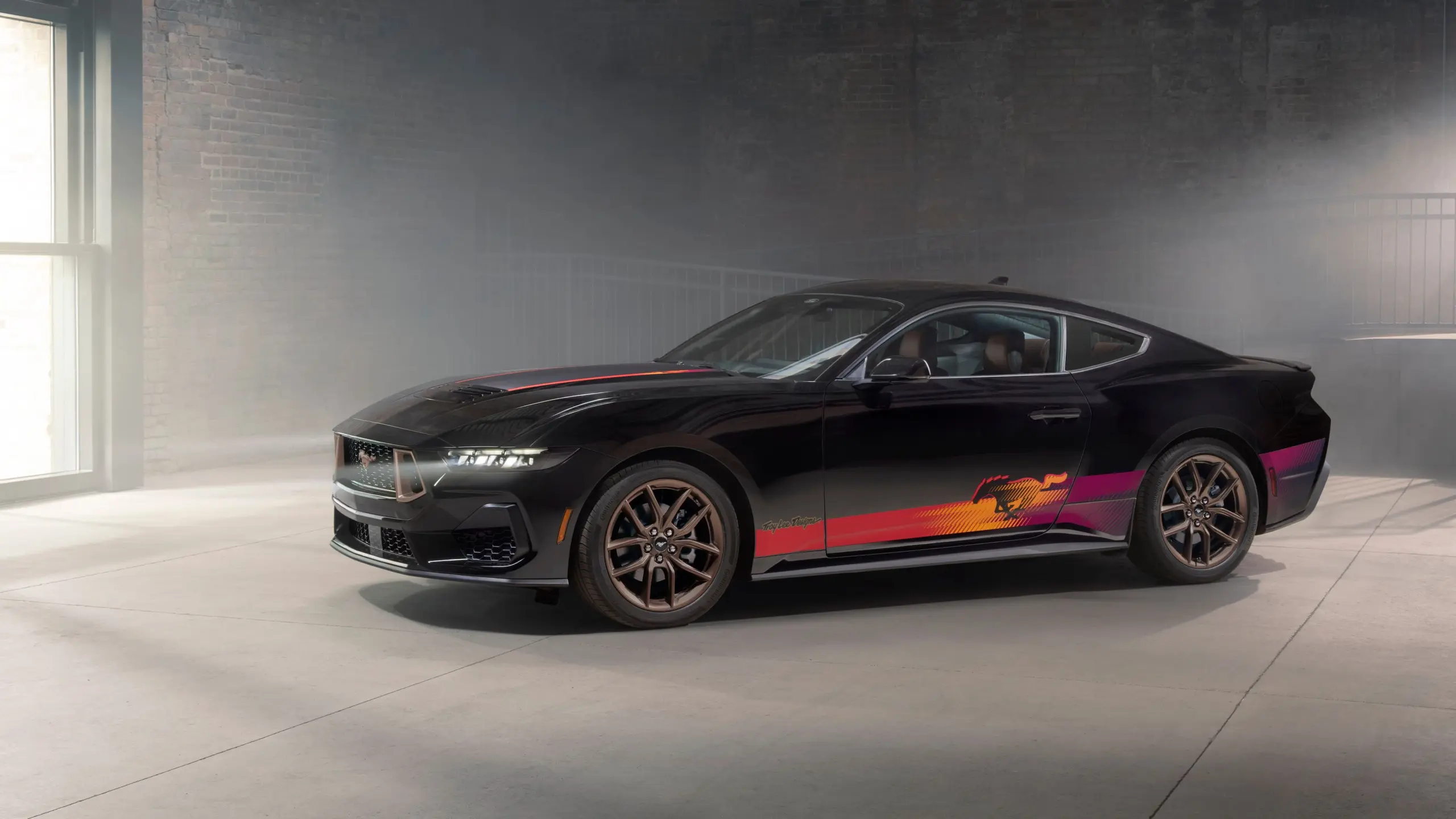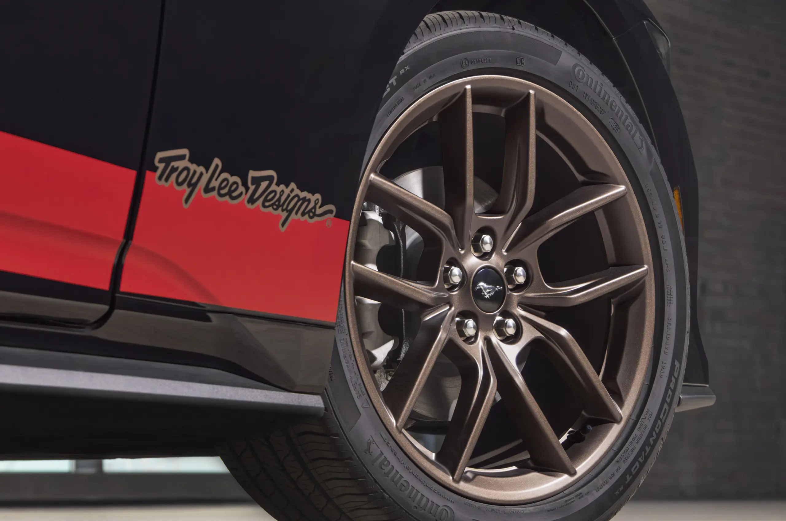 A Ford tervezőcsapatával együttműködve a Troy Lee Designs élénk vörös, narancs, lila és sárga oldalsó grafikákat fejlesztett ki, amelyek magukba foglalják a Mustang-emblémát. A kizárólag fekete színű autókhoz elérhető csomag élénk grafikái és az alapfelszereltséghez tartozó 19 colos bronz színű felnik valóban feltűnővé teszik az autót, ha már a hangja nem fogja, hiszen csak az Ecoboost, tehát a kisebbik motorral forgalmazzák.