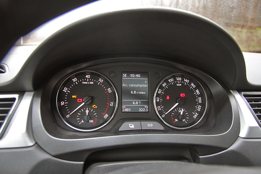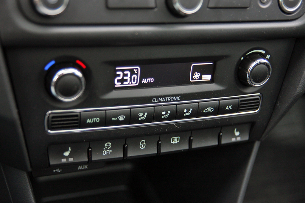 Elegance StylePLUS csúcsfelszereltségű tesztautónk műszerfala egyszerűnek, ízlésesnek, informatívnak találtatott ezüst dekorbetétestül, bőrhuzatú kormányostul és érintőképernyős navigációs rendszerestül. A plasztikok helyenként kemények, kopogósak, olcsók. Az ellátmány lényegesebb elemei még: menetstabilizáló, függönylégzsák, kanyarkövető fényszóró, tempomat, utasoldalon is magasságállíthatós ülés, (egyzónás) automata klíma, ülésfűtés elöl, Bluetooth, tolatóradar. Modern sofőrsegédek, mindenféle hiper-szuper extrák nincsenek, még egyszer: ez nem Octavia, Golf, Leon vagy A3. De ami kell, van. És megfelelő minőségben és tálalásban. Simply Clever-dolgokat is kínálva, mint a tanksapka fedelébe rejtett jégkaparó, vezetőülés alatti rekesz a láthatósági mellénynek, ajtóba helyezhető hulladéktároló, parkolójegytartó, multimédiáseszköz-tároló, függőlegesen a hátsó ülések mögé süllyeszthető kalaptartó.