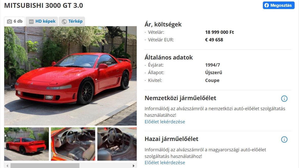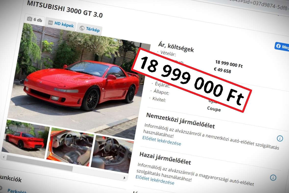 Elsőre rengeteg pénznek tűnhet a majd' 19 millió forint egy 29 éves autóért, ám ez a Mitsubishi meglepően különleges. A típus a Chrysler és a Mitsubishi közös fejlesztéseként készült, három generációt élt meg. A konkrét autó ráadásul teljesen restaurált és valamivel erősebb is a gyári állapotnál, a hirdetés szerint 345 lóerőt rejt az ikerturbós V6-os az orrában. Az árat persze mindenképp gyűjtői, vagy befektetői szemmel kell nézni, az eladó állítása szerint jelenleg is gyűjteményből eladó ez a 3000GT.