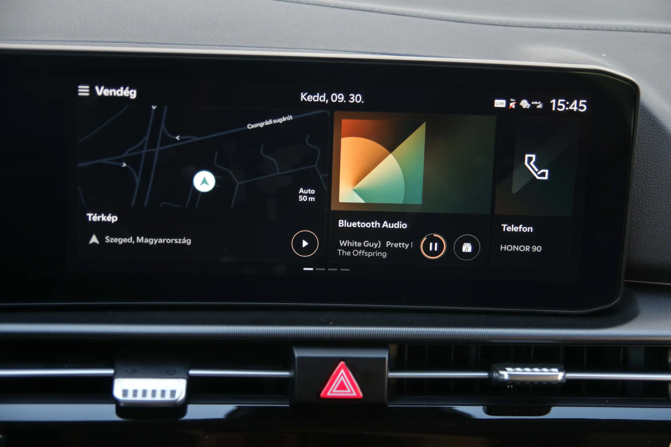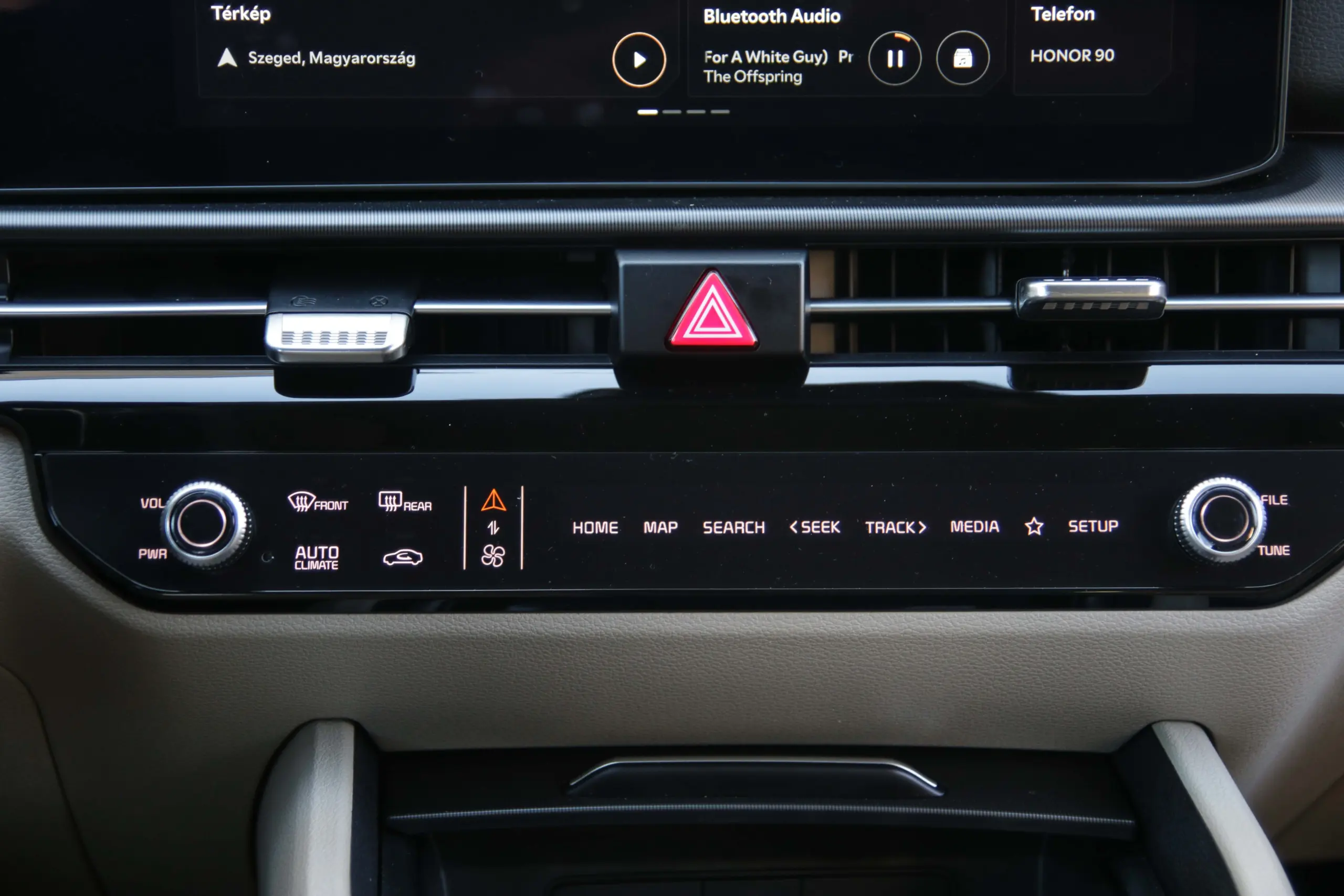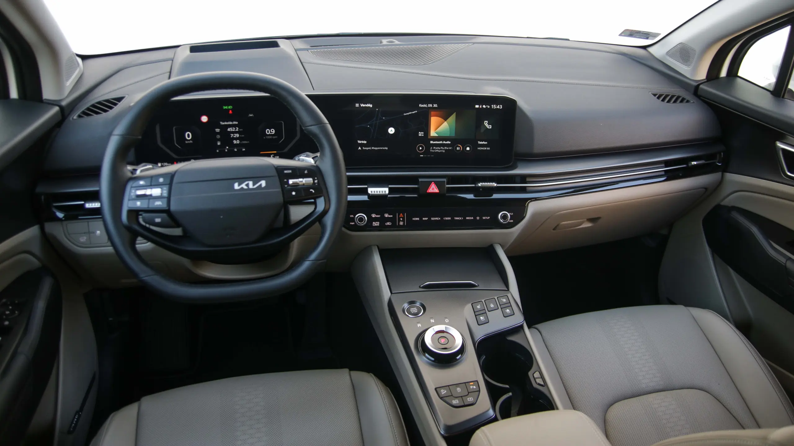 Az utastérben is akadnak változások, ám itt is elsősorban az esztétika a különbség. Az összkép visszafogottabb, miközben a két, egyenként 12,3 colos kijelző már a modernebb Kia trendeket követve osztozik egy közös üveglapon. Leköszöntek a furcsa formájú szellőzők is, ám az is egyértelmű, hogy műszaki téren nem sok változott a műanyagok alatt. Megmaradt az érintőgombokból álló csík is, ami egy előválasztó gombbal klímavezérlőként vagy az autó fő funkcióinak kezelőfelületeként is működhet. Egy menő, mutogatni való részletnek továbbra is oké, de használat közben nagyjából a második napra untam meg, sokkal egyszerűbb lett volna minden funkciónak állandó helyen hagyni egy gombot, és kész. Persze, a mai világban a letisztultság, illetve a stílus fontosabb, mint a praktikum, ez a vezérlőegység is ékes példája ennek a trendnek.