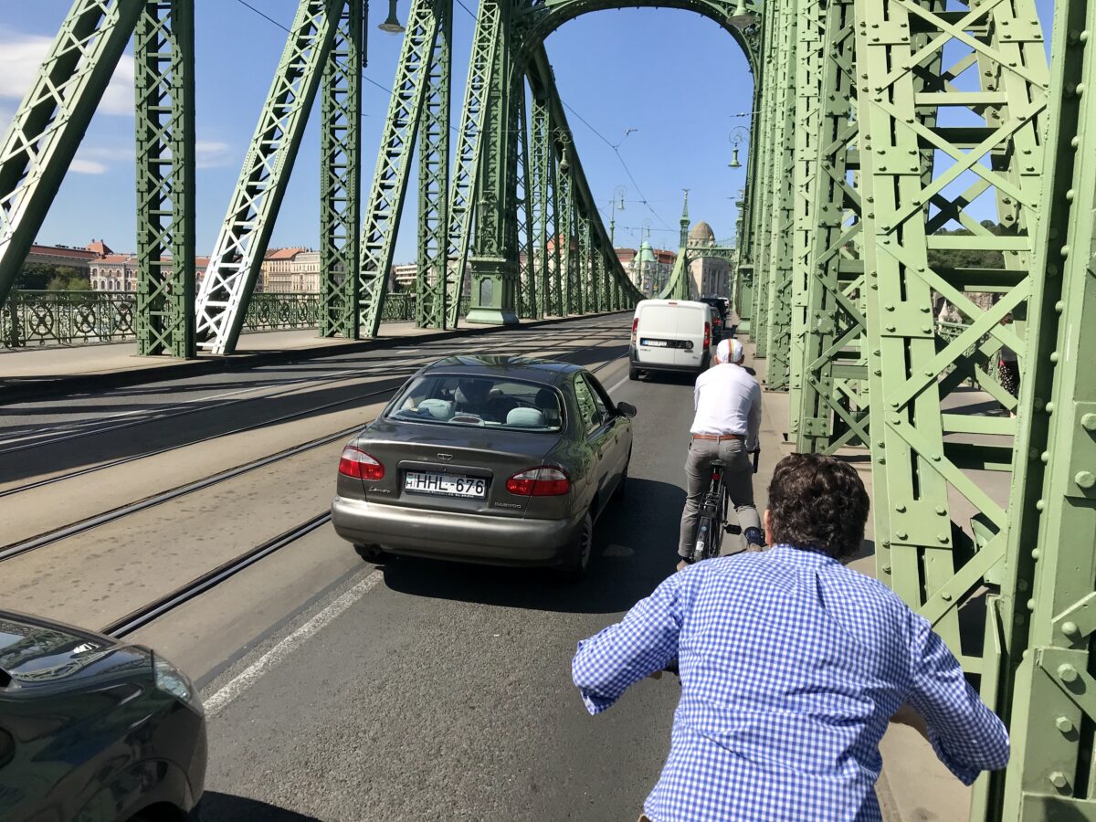Van honnan felzárkózni, hiszen bár hazánkban európai összevetésben is elég jó a bringahasználati arány. A lakosság 17 százaléka számára a kerékpár az elsődleges közlekedési eszköz, a rendszeresen kerékpározók aránya 70 százalékos, ám országos viszonyban azért bőven van eltérés: míg a Dél-Alföldön 34% a kerékpár, mint elsődleges közlekedési eszköz aránya, Pest megyében csupán 8%, ahonnan bizony van még hova fejlődni. Alap probléma, hogy egy-egy autóban Budapesten jellemzően 1,2 ember ül, könnyű kiszámolni, ilyen telítettséggel megoldhatatlan, hogy a jelenlegi közlekedési igényszint mellett elegendő út és parkolóhely álljon rendelkezésre. Mi a megoldás? Csökkenteni kell a közlekedési igényt, amire megoldást jelenthet a távmunka, a home office karanténidőszakon túli alkalmazása és bizony az is, ha az átlagosan alig több mint 1-1 ember által használt autók helyett helytakarékosabb közlekedési módokat, tömegközlekedést vagy kerékpárt használunk. [BANNER type="2"]A Szabadság híd kerékpárral nagyjából sehogy sem jó: a járdán szabálytalan a bringázás, az úton beszorulhatunk az autók közé, persze így is át lehet rajta érni fájdalommentesen. A forgalom csökkentése érdekében sávos napkezdést és a digitális technológiák (home office) terjedését szorgalmazza a főváros