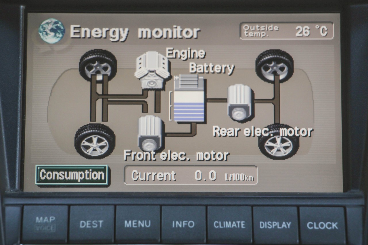 Sem a fogyasztási adatokat részletesen megjelenítő középkonzoli érintőképernyő, sem a vezető előtti műszerek közötti fedélzeti számítógép nem mutatja a megtehető hatótávot