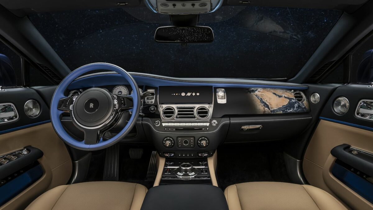 Az első utas előtti műszerfal-részlet szintén a motorháztetőn is megjelenő műholdfelvételt viseli magán, itt már teljes színskálájával, ami bár elképesztően élethű, igazából nem fotó, hanem kézzel felvitt festmény. A hátsó "vízesésen", azaz az ülések közti díszpanelen művészi felhők jelennek meg, és további apró részleteken is fel lehet még fedezni a Földet és a többi bolygót, hol ezüst, hol arany árnyalatokban.