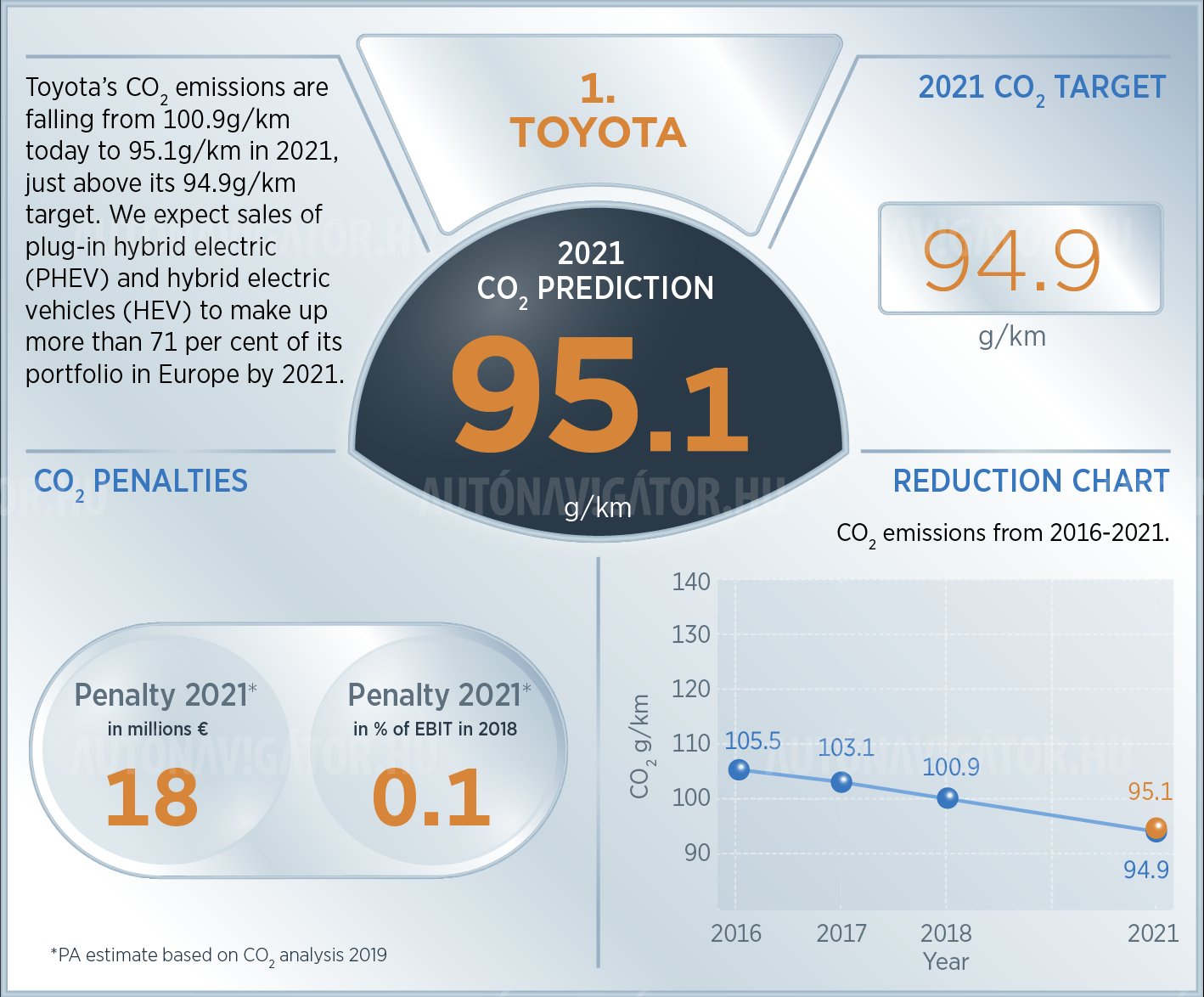 Egyetlen vezető autógyártó van, amely teljes mértékben elkerülheti a büntetéseket, ez pedig nem más, mint a Lexus prémium márkát is jegyző, Európában értékesített autóinak 75%-át a kontinensen is gyártó Toyota. A PA Consulting tanulmánya ugyan még a vezető autógyártók között messze a legjobban teljesítő Toyota esetében is számol minimális büntetéssel (18 millió euróval, azaz a vállalat világszintű profitjának 0,1%-ával), figyelembe véve azonban azt, hogy 2019-ben az európai Toyota értékesítések 61%-át, a Lexus eladásoknak pedig 96%-át tették ki a hibrid autók, az arány pedig idén várhatóan még tovább nő majd, a Toyotának jó eséllyel egyáltalán nem kell majd fizetnie, hiszen minden valószínűség szerint a 95 gramm/kilométeres határérték alatt végez majd. Ez a Lexusszal együtt a piac legszélesebb, Európában mintegy 20 modellből álló hibrid palettáját kínáló, és ezzel gyakorlatilag minden személyautó szegmenst lefedő Toyota számára hatalmas versenyelőnyt jelent: nem kényszerül áremelésre és modellek megszüntetésére sem, ráadásul a világ legnagyobb akkumulátorgyártási kapacitása fölött diszponálva (a saját kapacitásokon túl stratégiai együttműködésre lépett a világ vezető akkumulátorgyártóival, a CATL-lel, a Panasonic-kal és a BYD-del) különösebb szállítási nehézségek veszélye nélkül szolgálhatja ki a megnövekedő keresletet.