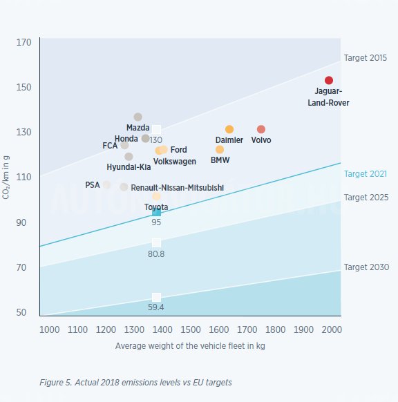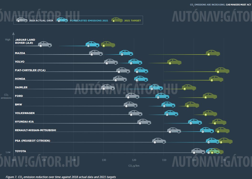 Nem a világ legegyszerűbb ábrája, a szürke autók jelölik a 2018-as értékeket, az alsó skála ráadásul jobbról balra növekvő, ha viszont értelmeztük, látható, hogy a Toyota áll a legközelebb a 95 gramm/km CO2 értékhez