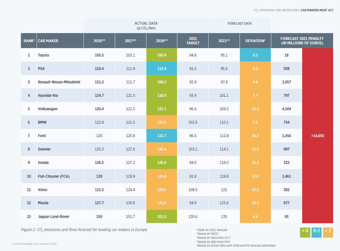 Ez a legtöbb márka számára gigabírságokat jelent majd, ami drasztikus hatással lehet a profitabilitásukra, hacsak nem építik be a büntetés összegét az új autók árába, és/vagy nem szüntetnek meg számos modellt és hajtásláncot a kínálatukban. Az egyetlen autógyártó (az Európában egyelőre marginális értékesítéseket jegyző Teslát leszámítva), amely elkerülheti a büntetéseket a Lexust is jegyző, az elmúlt 22 évben világszerte több, mint 15 millió környezetbarát hibrid autót értékesítő Toyota, amelynek európai értékesítéseiben már most 63%-ot tesznek ki a hibridek. A legtöbb autógyártó mumusának számító 95 g/km CO2 érték nem öncélú, az éghajlatváltozás miatti, növekvő aggodalom szülte, igaz a kitűzött érték és bírság valóban elképesztő súlyú. A PA Consulting számításai szerint akár 14,5 milliárd euró pénzbírságot is kiszabhatnak az európai piacon legnagyobb 13 autógyártóra a szabályzás miatt. Mindezt úgy, hogya 2020-as még átmeneti év, melyben a kilométerenként 50 grammnál kevesebb szén-dioxidot kibocsátó részben vagy teljesen elektromos autók duplán kerülnek beszámításra, illetve a flották legjobban szennyező 5%-a nem kerül figyelembe vételre.