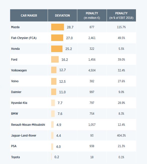 Az autógyártókra eső bírság mértékét modelljeik CO2 emissziója és volumene határozza meg, a Mazdánál és a Fiat-Chrylser csoportnál a profitjukhoz mérten jelentős, a Toyotánál elenyésző várható