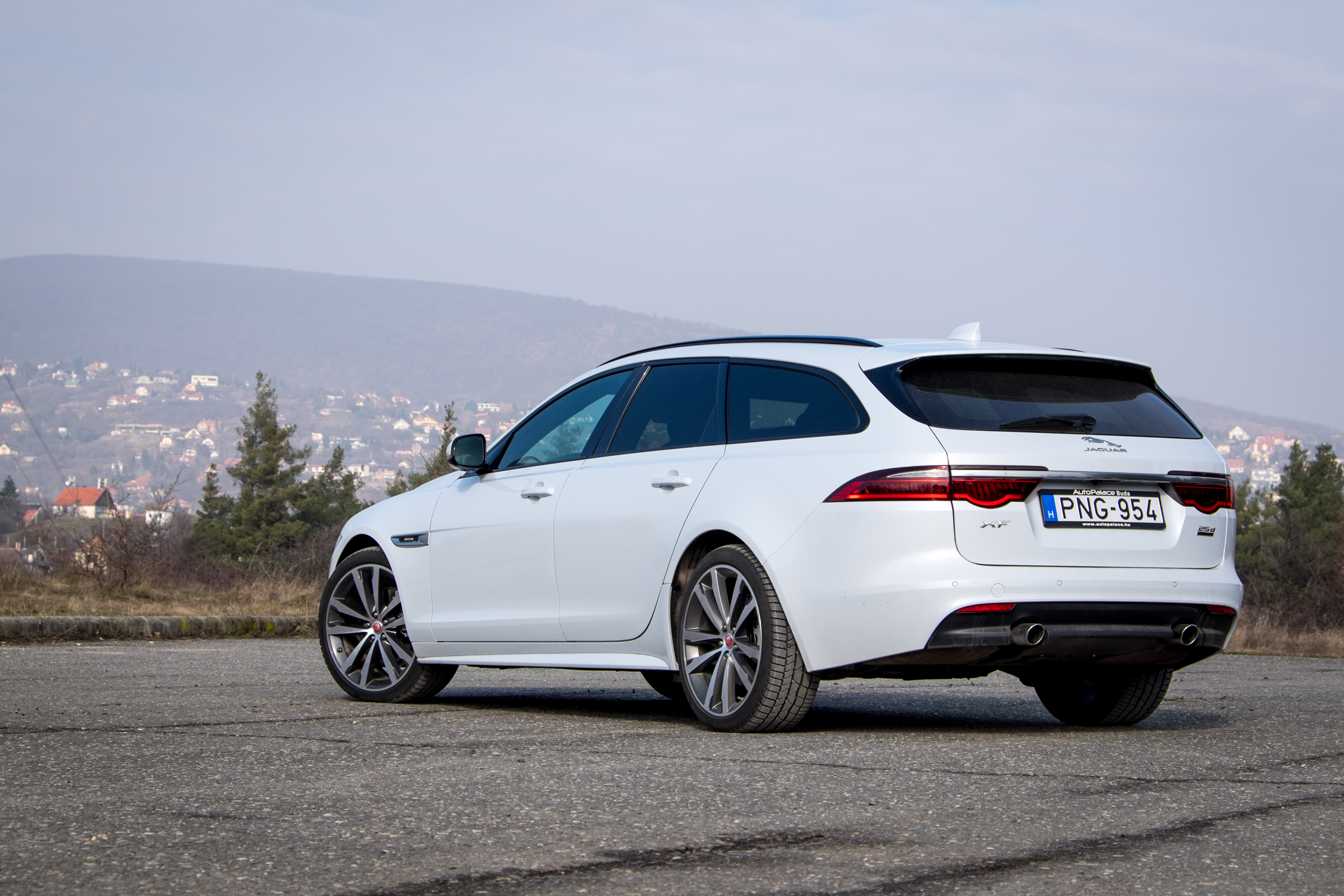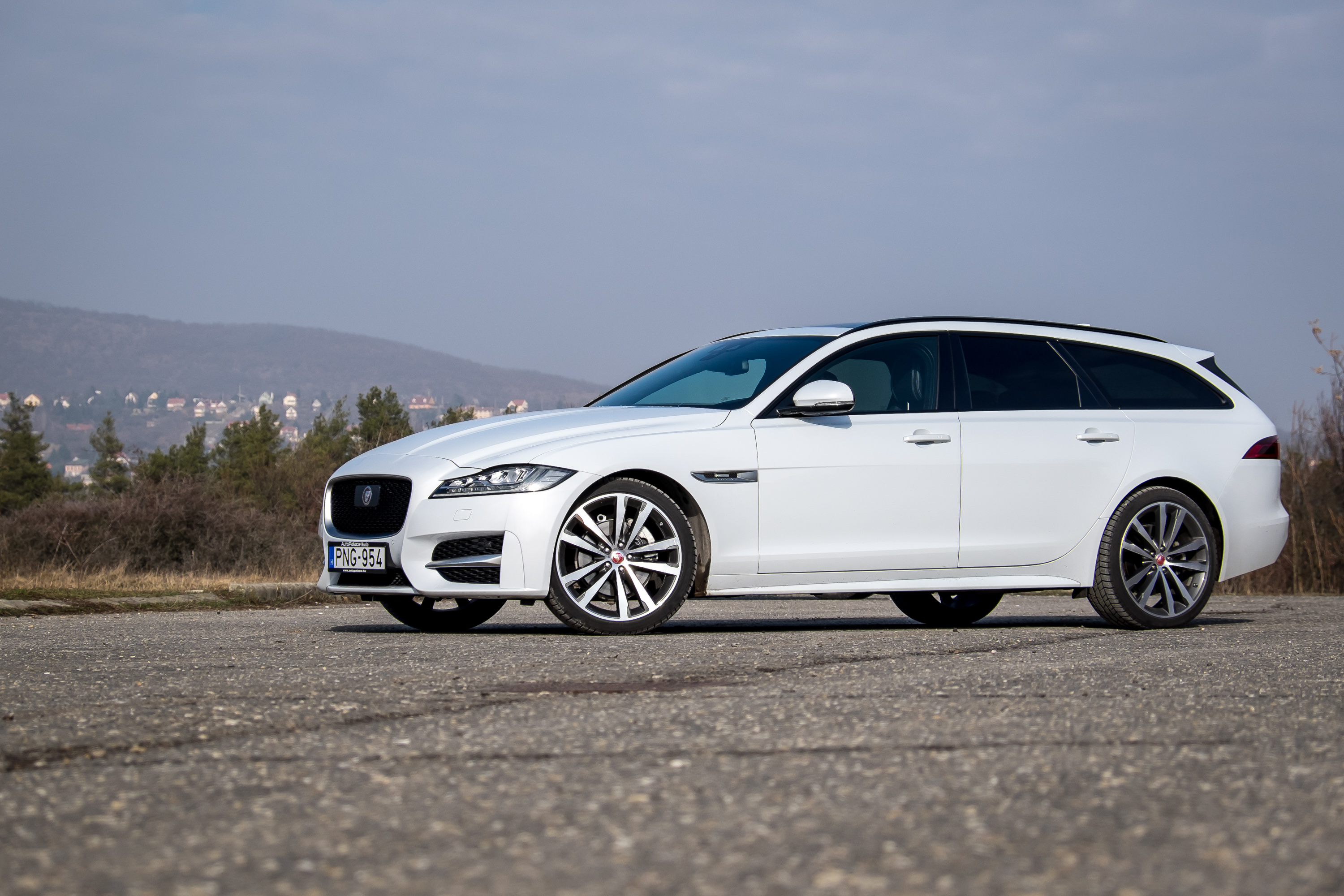 Ez egy R-Sport kivitel, ami leginkább az első lökhárítón látszik, meg odabent. Feketék az ablakkeretek, amik a fagyos, kicsit kékes fehér fényezéssel a lehető legkontrasztosabb képet adják. A Jaguarokban benne van az ugró nagymacska lendülete, egyetlen kombijuknál sincs ez másként, a formája lendületes, meggyőző, agresszív, mégis elegáns, és mindez tökéletes egyensúlyban van egymással. A hajtással való kontraszt viszont legalább olyan erős, mint a külső megjelenése.Elegáns a beltér kialakítása is, van zongoralakk is, valamiért ez a prémium modellekben kötelező, ezt viszont jól egyensúlyozták az alumíniummal, sajnos sok a műanyag és a sorja is