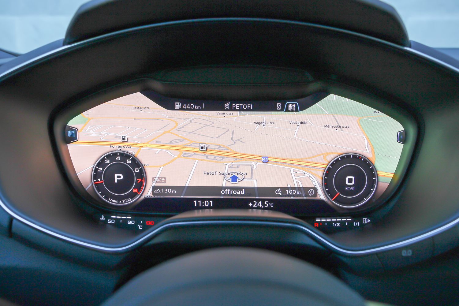 Kell még tovább fényezni? Nem, de olyan jól esik. Hiszen a TT-ben elsőként integrálták a navigáció és a szórakoztató elektronika kijelzőjét a sofőr előtti műszerfalba. Az MMI középkonzoli kontrollerjét tekergetve is a sofőr előtti kijelzőn bogarászhatóak a kocsi beállításai, ezen kívül a kormányra helyezett gombokkal vezérelhető a fedélzeti számítógép. Az egész hamar átlátható, nem sokkal bonyolultabb, mint ugyanez két kijelzővel és bár én szoktam idegenkedni az efféléktől, de a head-up displayt és a Peugeot I-Cockpitját is jónak tartom, így erre is csak azt tudom mondani, hogy ügyes és egyedi. Nagyon illik a TT technós hangulatához, ahogy a csak egyzónás klíma légbeömlőkbe épített kapcsolói is.
