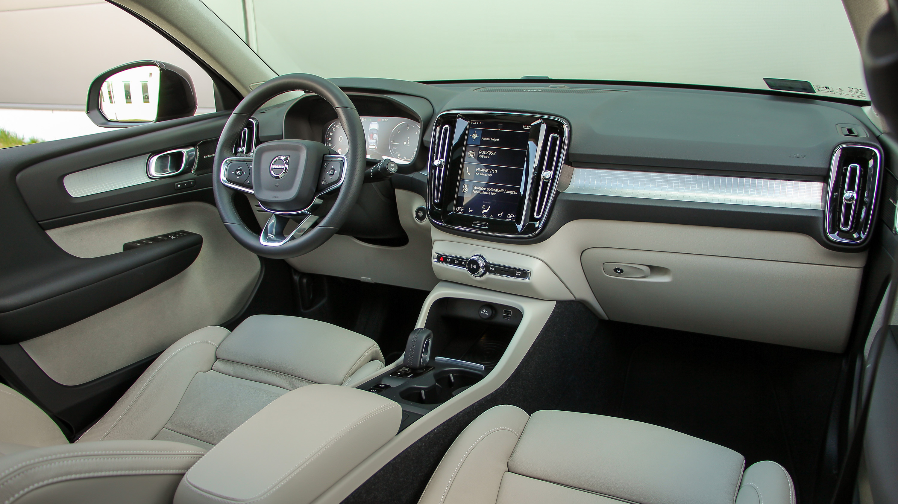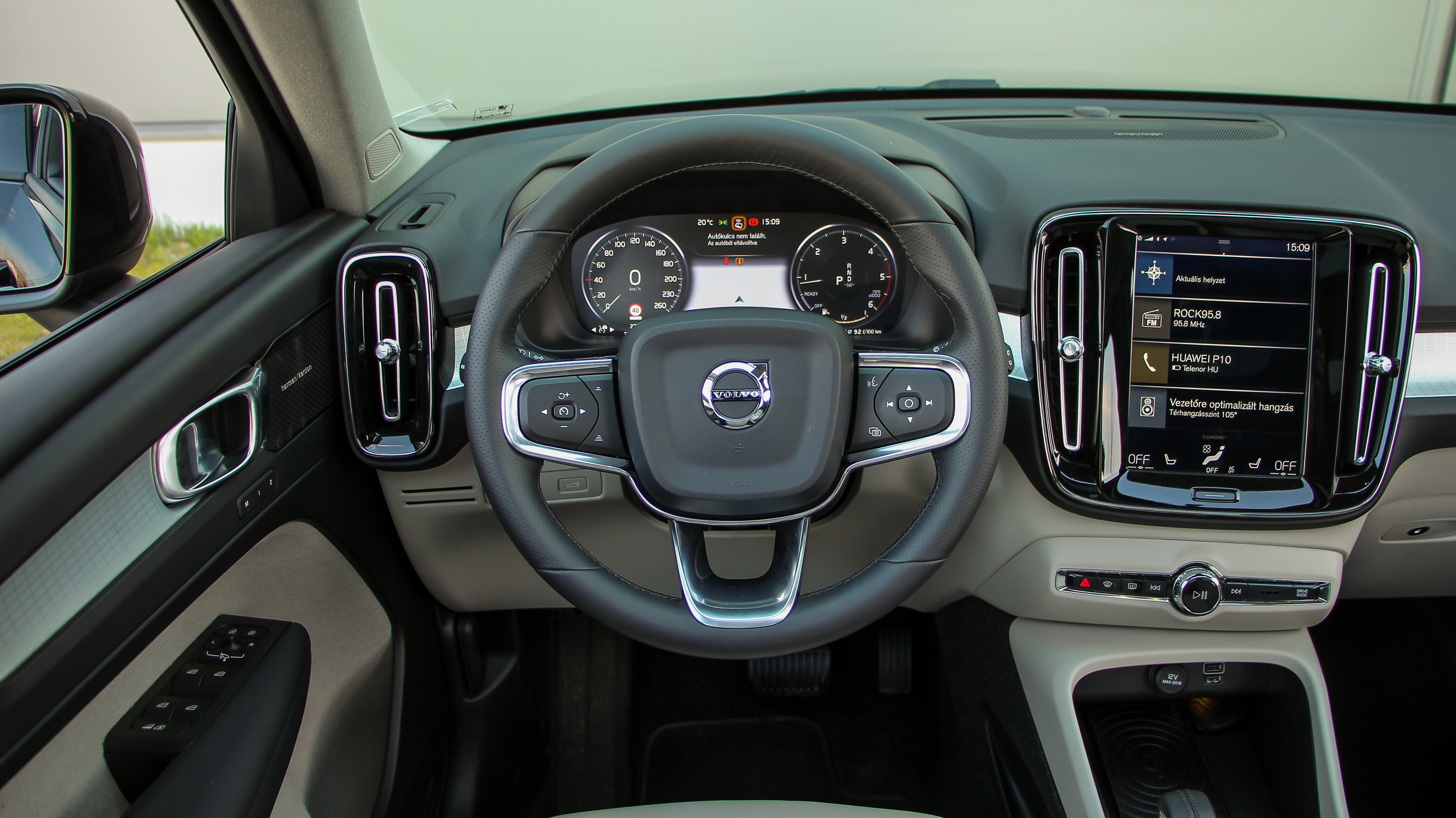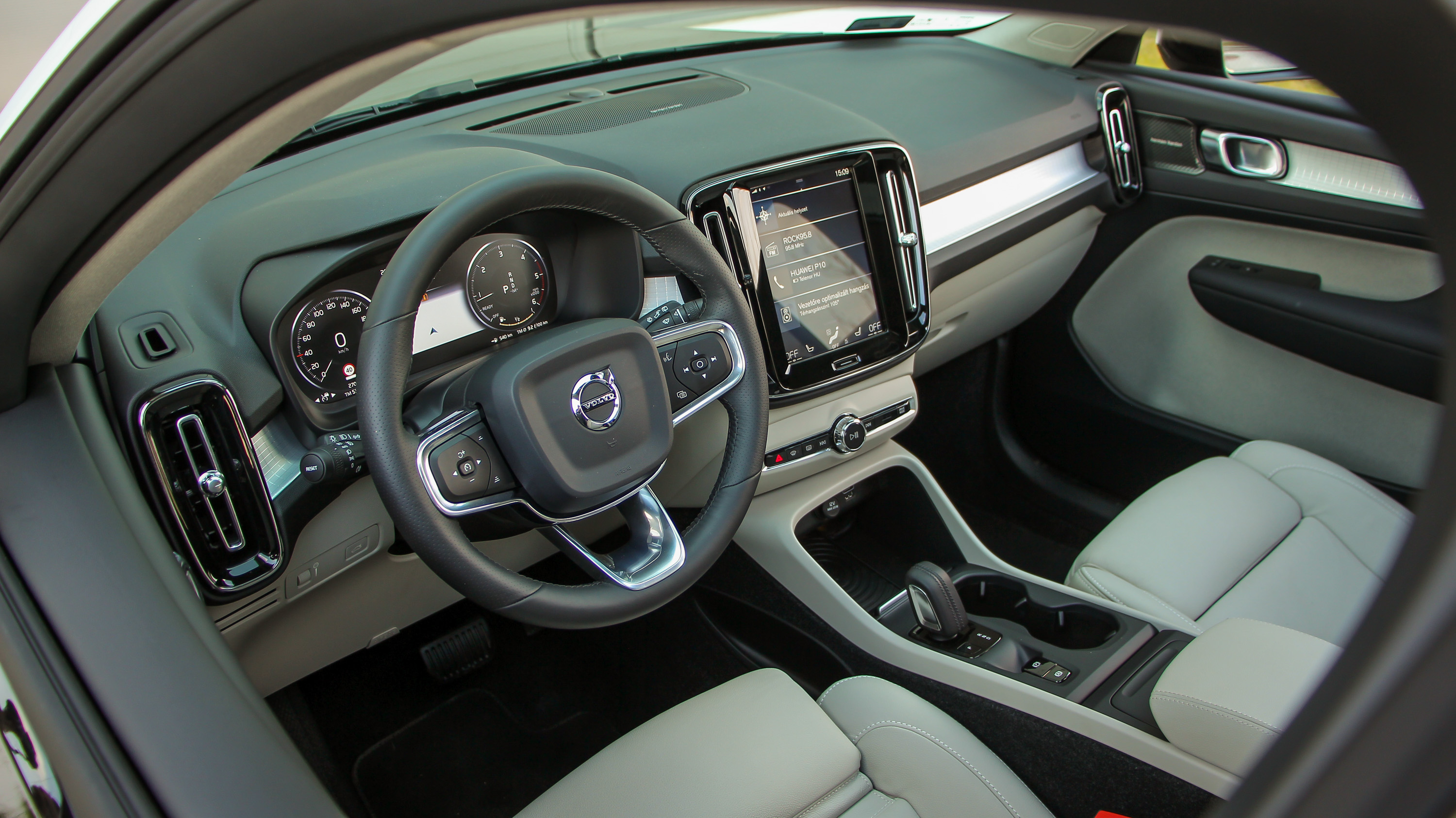 Azt sem fogjuk elfelejteni, hogy Volvóban ülünk, annyira skandináv, annyira letisztult és minőségi a beltér. A jól felszerelt, bőrüléses tesztautóból nem hiányzott a Volvo legkellemesebb illata, a műszerblokk digitális, akár a navigációt is megjelenítő, a központi Sensus rendszer hatalmas érintőképernyője pedig olyannyira felhasználóbarát, hogy igazából azt sem fájlaltam, hogy a klíma csakis onnan vezérelhető. A hifi, ami opcióként Harman Kardon, nem csak iszonyatosan jól szól, hanem tekerhető hangerőszabályzót is kapott, ami annak ellenére elég hasznos és jó megoldás, hogy természetesen a kormánykerékről is vezérelhető.