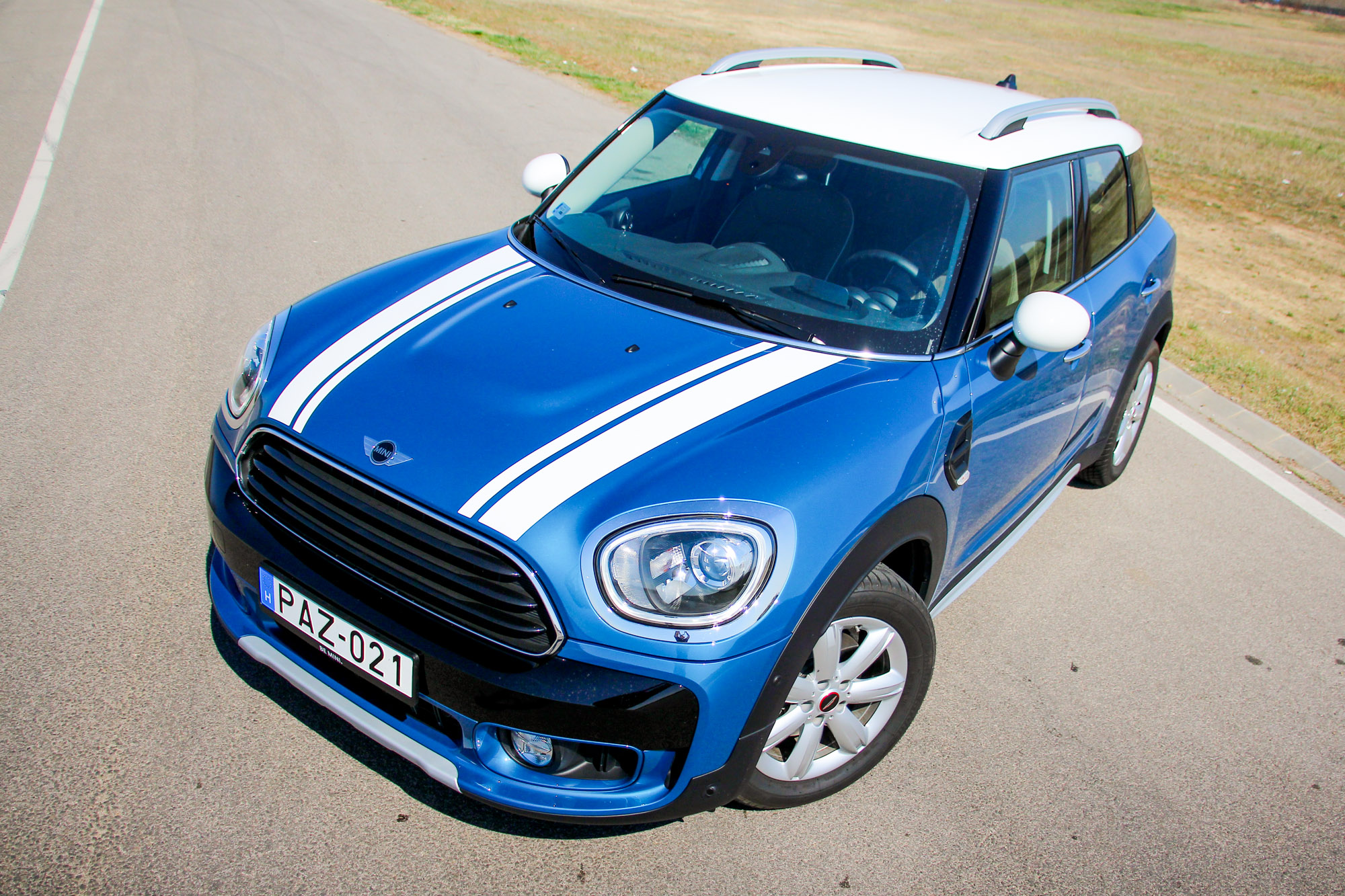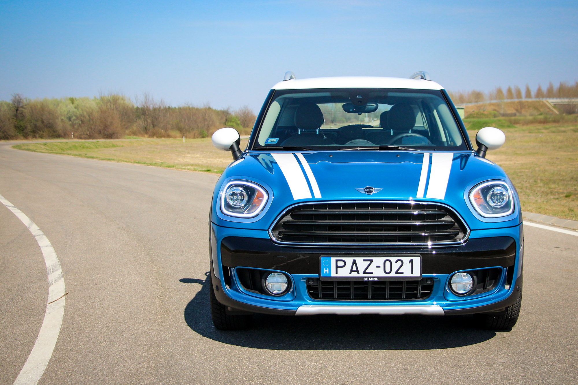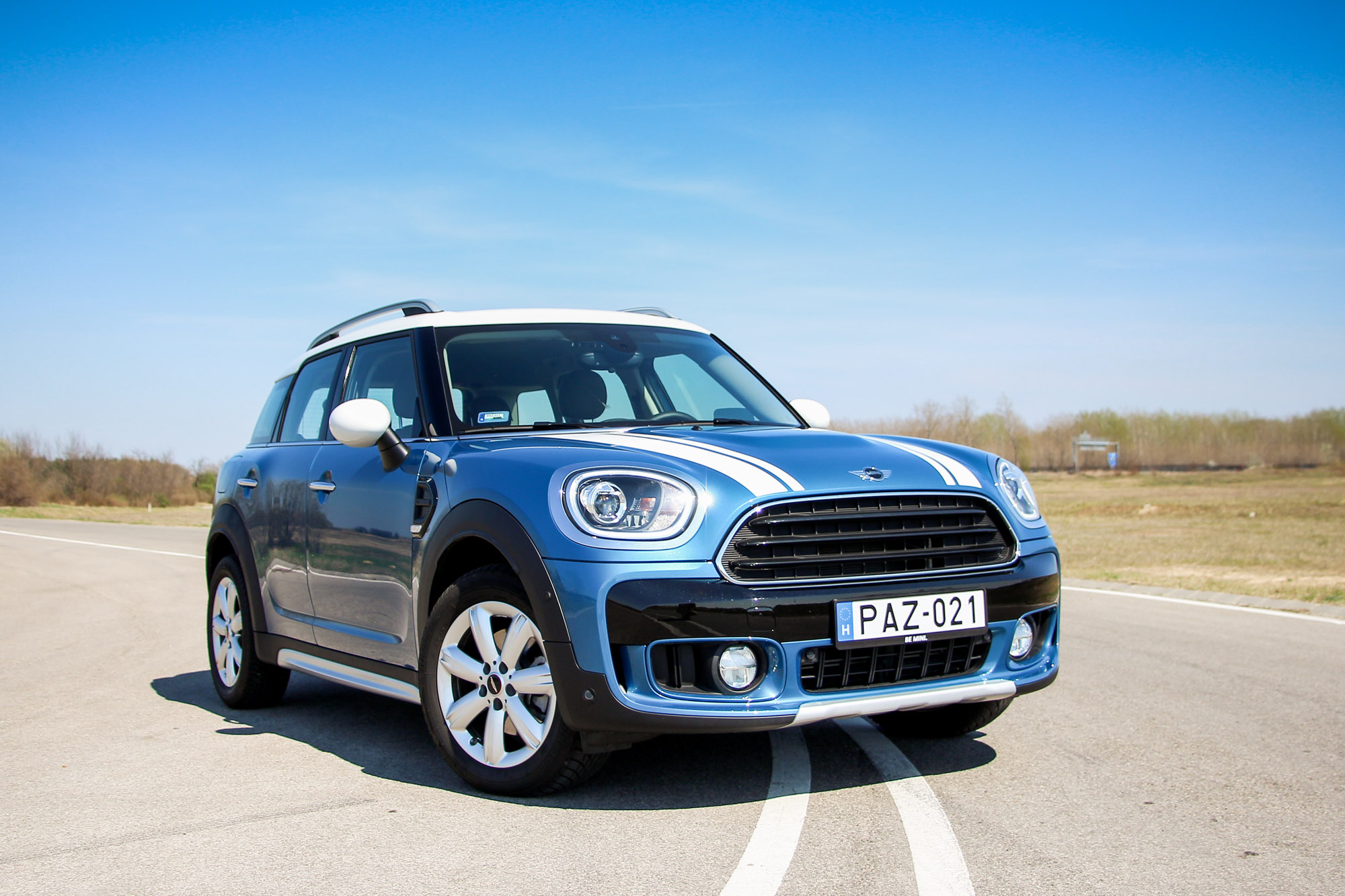 A jó méretű Cooper. Jobb lett volna az összhang egy benzines motorral, a BMW kétliteres dízele persze bivalyerős, dinamikus, turbólyukról csak nagyon messziről hallott. Gázra azonnal ugrik, a 20 Celsius fokot közelítő kora nyári időben még téli gumikkal kaptuk, így rendszeresen nyikorogtak elöl, hamar érkezik a nyomaték. Viszont csúnyán belerondít az összképbe a hangja, míg bent ülünk, addig jó, mert klasszul leszigetelték az utasteret, fotózás közben volt illúzióromboló a csúnya kerregés. Ez persze nem kell, hogy érdekeljen, ha olyan szerencsések vagyunk, hogy benne ülünk, a kormányzása ugyanis tökéletes, hihetetlenül közvetlen és pontos, futóműve szintén zseniális, kényelmes, ugyanakkor feszes és határozott, amiben a 17-es téli – John Cooper Works kupakos – felnire szerelt ballonos gumik sokat segítenek. Olyan vezetni, mint a normál Coopert, és ez nem túlzás, csak közben van körülöttünk egy normális autó.
