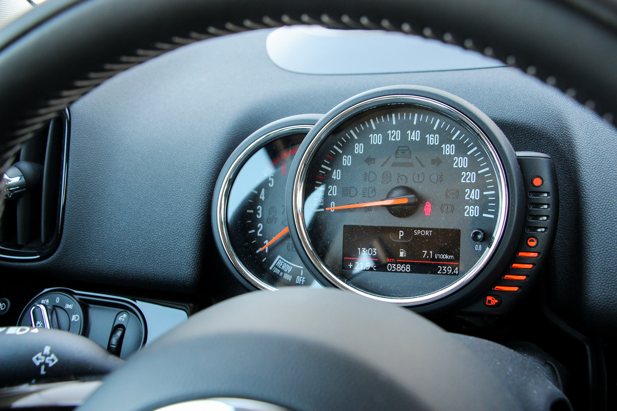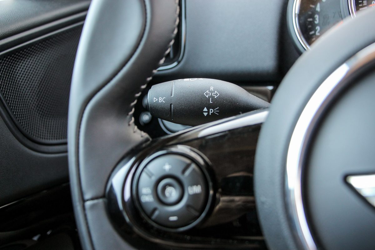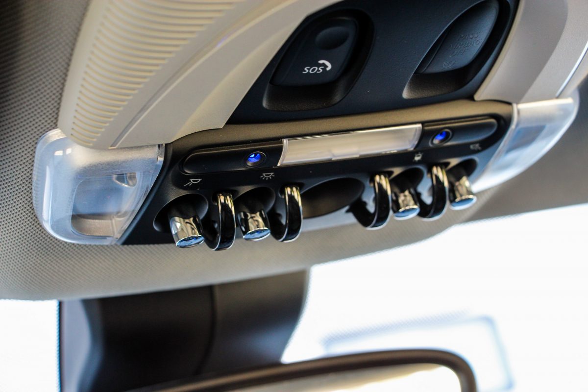 Az apróságok teszik színessé. Például a feláras bőr sportkormány brit zászlója, vagy a rekeszek skótkockás padlója is ügyes kiegészítő. A billenőkapcsolók még mindig őrülten jók, a fura kerek belső kilincsek szokhatóak, egy Mini sosem lesz unalmas. A Harman/Kardon hifit azért érdemes hozzá megrendelni, az alap sem rossz, főleg, hogy bluetoothon is rendesen képes zenét lejátszani, de mély hangja lényegében nincs. Az antenna villogását azzal magyarázzák, hogy így könnyebben megtaláljuk a parkolóban, ezt sajnos nem tudtam kipróbálni, mindig emlékeztem, hová raktam le, és különben is hamarabb látjuk meg a virító fehér tetőt.