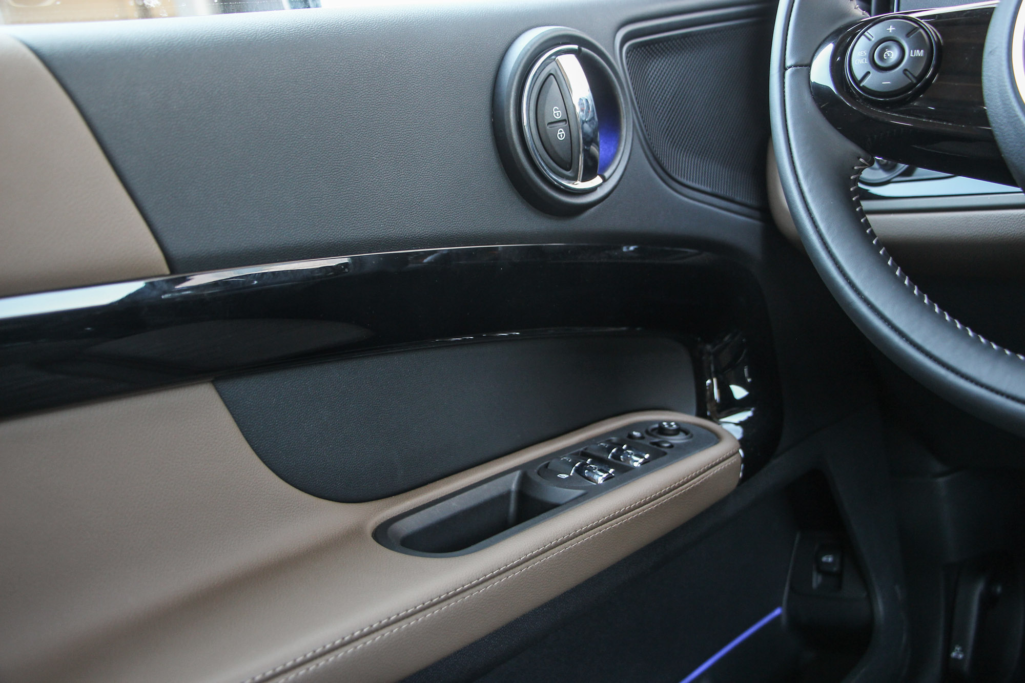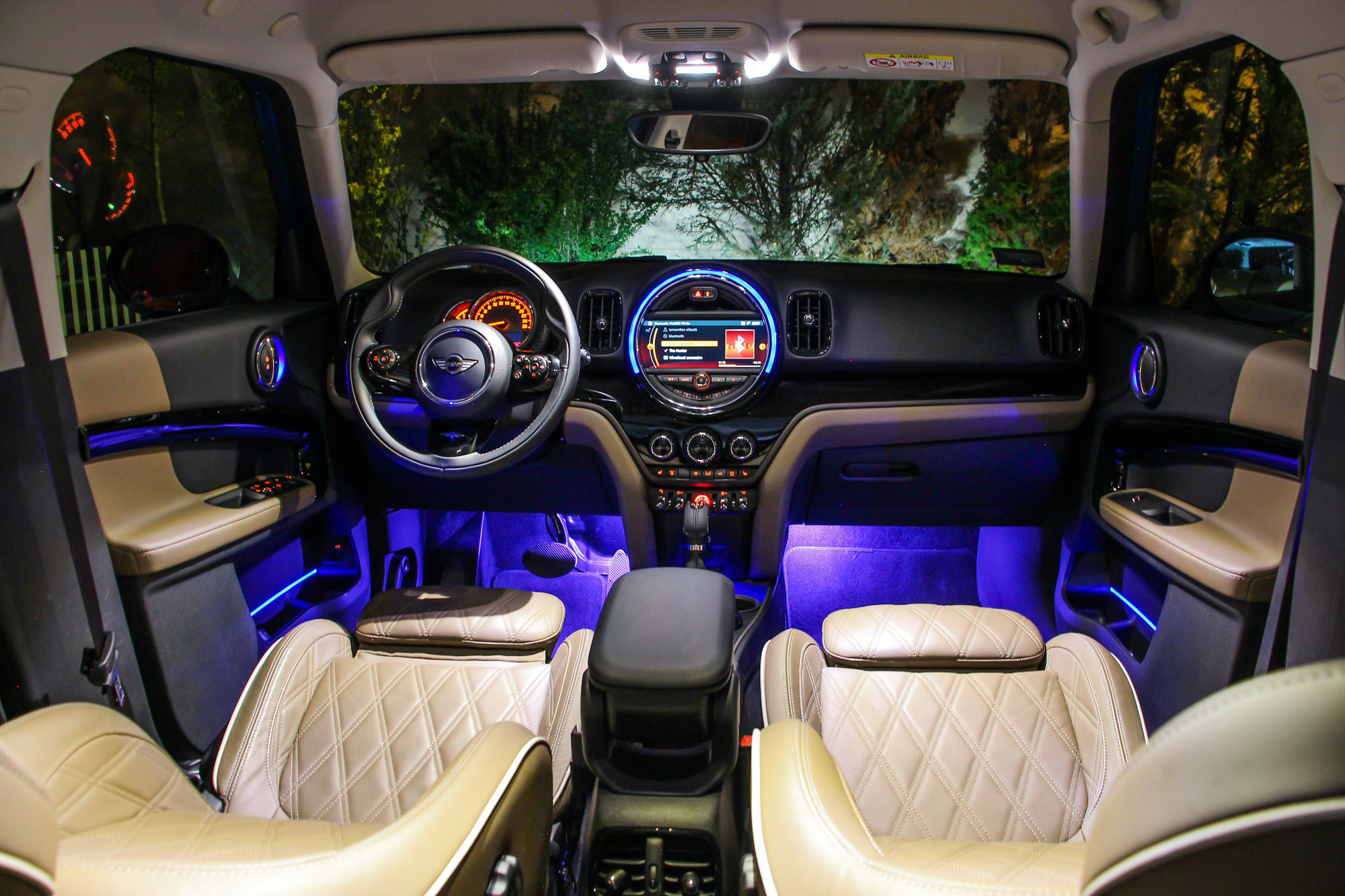 Fényárban a beltér, a hátul ülők is kapnak a lábtér-világításból, a teljes színskálát képes előadni, hangulatos odabent, a barna bőrhuzattal együtt is