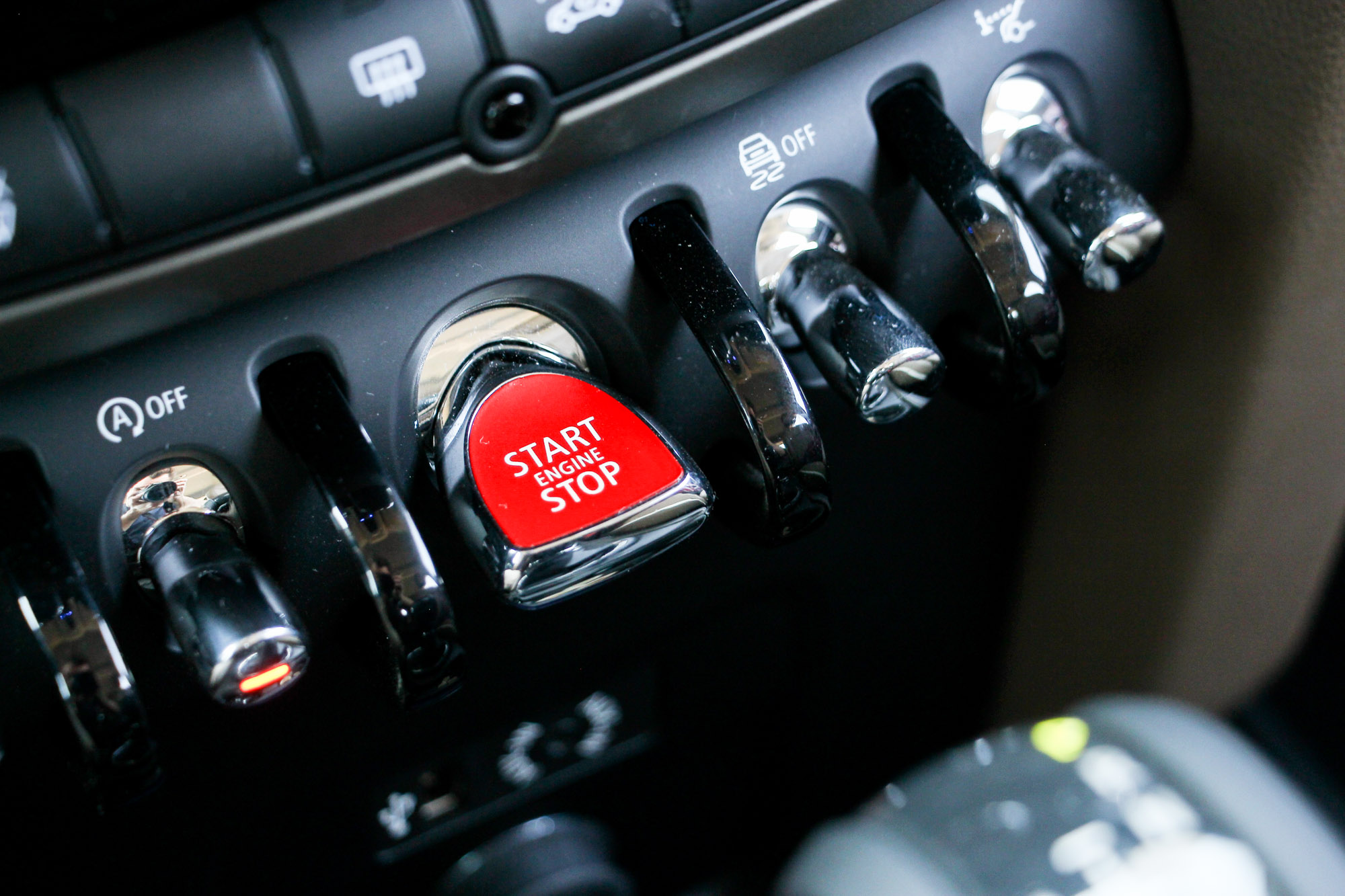 Vörösen pulzál, míg be nem indítjuk, elképesztően jó megoldás a repülőket idéző billenő gombsor, a plafonon is ilyen van