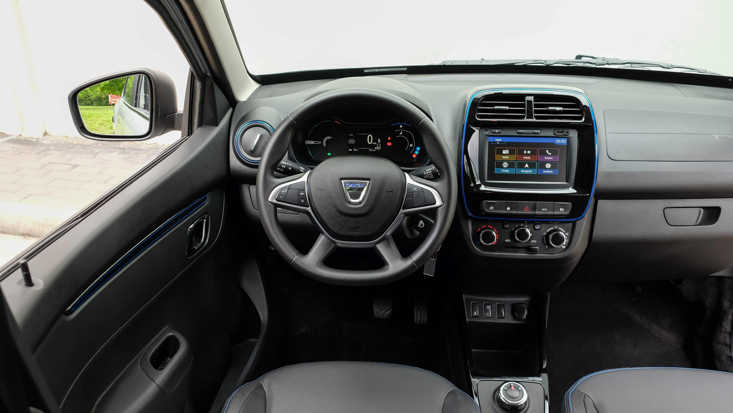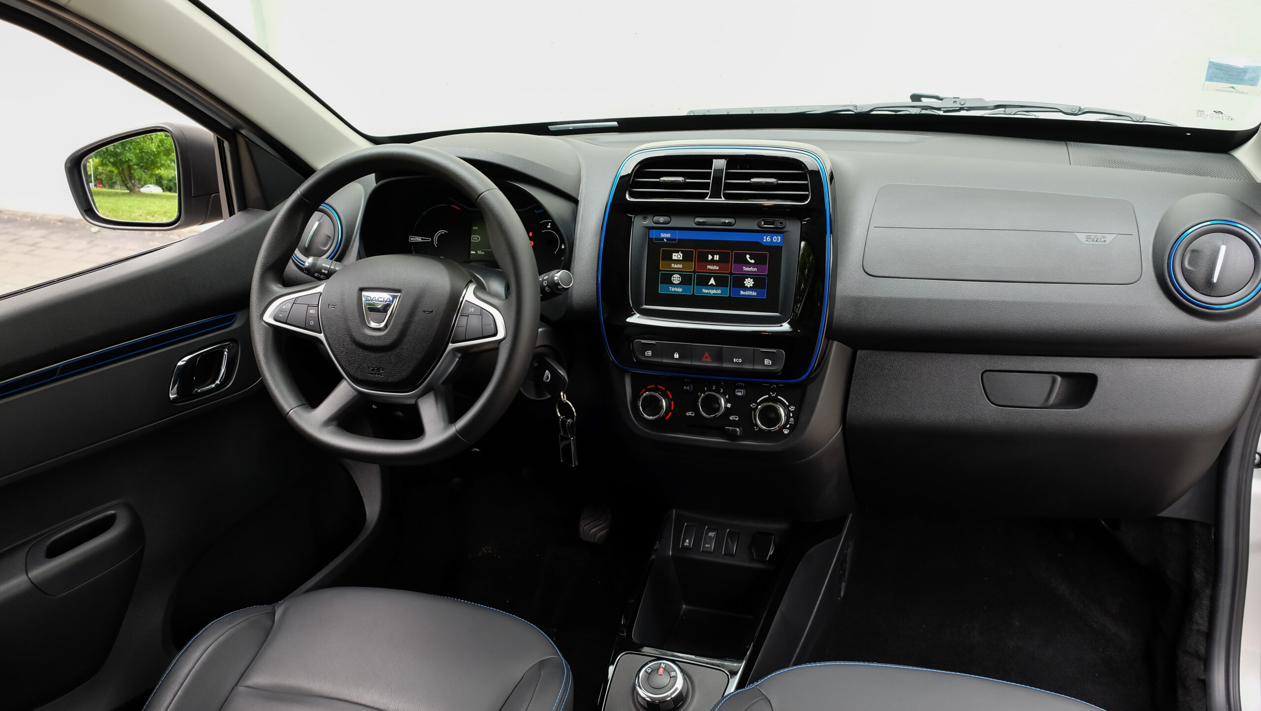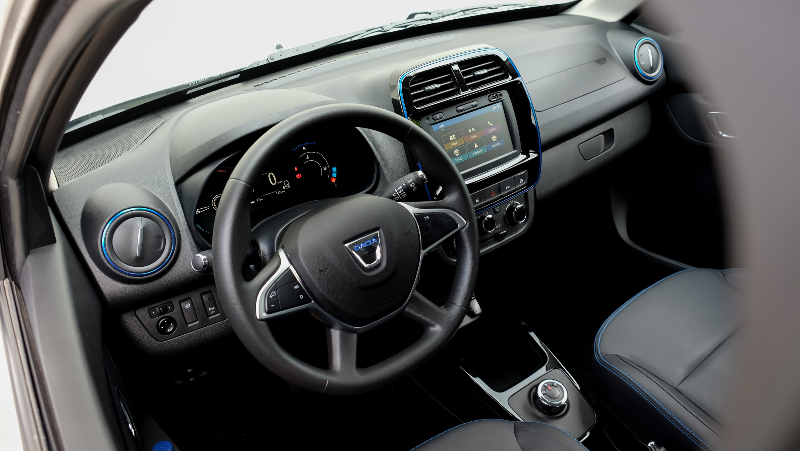 A négyüléses utastér hangulata és minősége sajnos elmarad attól a szinttől, amit az új Sandero/Logan páros már felvillantott. Nagyjából egy generációval le van maradva finomság terén a Spring. Legalábbis a most látott, a hazai sajtót körbehaknizó Stage1 (1-es fázisú) és carsharing kivitelű, mondhatni előszériás autókban. A műanyagok mind kemények, de az összeszerelés legalább korrekt. Vannak kemény spórolások, amik nem vészesek, inkább megszokandók és elfogadandók, ilyen az, hogy az első ajtókba annak ellenére nem vezettek át kábeleket, hogy a tükrök és az ablakok is alapáron (!) elektromos mozgatásúak. A tükröket a műszerfal bal széléről, az első ablakokat a középkonzol két oldaláról vezérelhetjük, a hátsókat pedig csakis a hátsó ajtókról. Ez persze letiltható, de ha a hátul ülő, akár gyermek lehúzta az ablakot, akkor két opciónk marad, ha mi vissza szeretnénk azt varázsolni: vagy meg tudjuk győzni, hogy húzza fel, vagy megállunk és hátranyúlunk. Míg akár egy előző generációs Loganban is szerepelt már a sebességfüggően reteszelő és persze a kilincs meghúzására is oldó központi zár, itt ilyen nincs, ha lezárjuk az ajtókat a középkonzoli gombbal, csakis azzal tudjuk oldani.