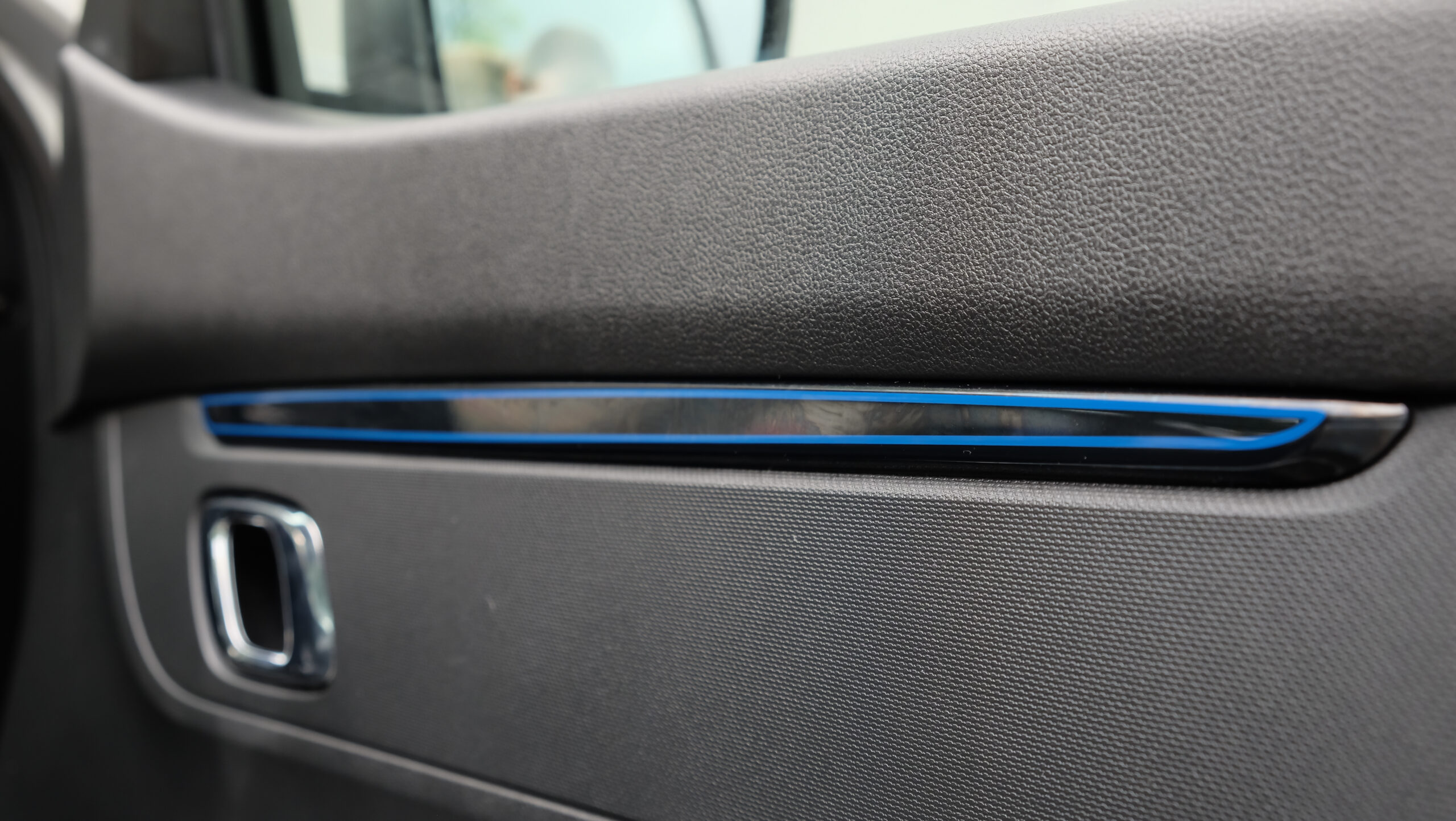 Ajtózsebeket - 0,5 literes palackokat szellősen fogadó tartóval - csak elöl kapunk, ahogyan a kárpitokra kék betétet is, a műszerblokk egyszerű és informatív, a végleges autókban fedélzeti számítógép is lesz; az érintőképernyőhöz Apple CarPlay is jár