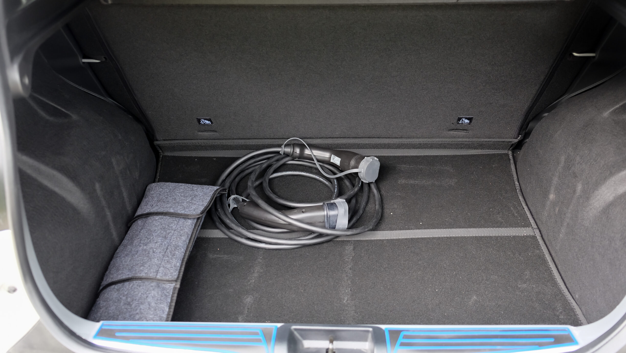 A 270 literes csomagtér aljába a Comfort Plus alapáron kap pótkereket, az alap Comfort esetén csak defektjavítót kapunk. Töltőkábelből alapáron csak konnektoros jár, a Type2-es felára 100 ezer forint