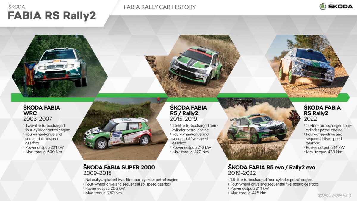 A Favorit 1991 és 1994 között sorozatban négy győzelmet ünnepelhetett a Monte Carlo Rallyn, az utolsó kettő ráadásul kettős győzelem volt. Utódja, a Felicia 1997-ben szintén diadalmaskodott a Monte Rallyn, úgyhogy ezen felbátorodva a Škoda belépett a rali-világbajnokság legfelsőbb osztályába: megépítették az Octavia WRC-t. Aztán 2003-ban a Fabia WRC érkezett az első generációs Fabia alapjain, de a folytatásban aztán a Super 2000 kategóriába váltottak, 2009-ben debütált a Fabia Super 2000. Ezzel az autóval 2013-ban Monte-kategóriagyőzelmet ünnepelhettek, 2010 és 2015 között pedig további négy dobogós helyezést értek el.