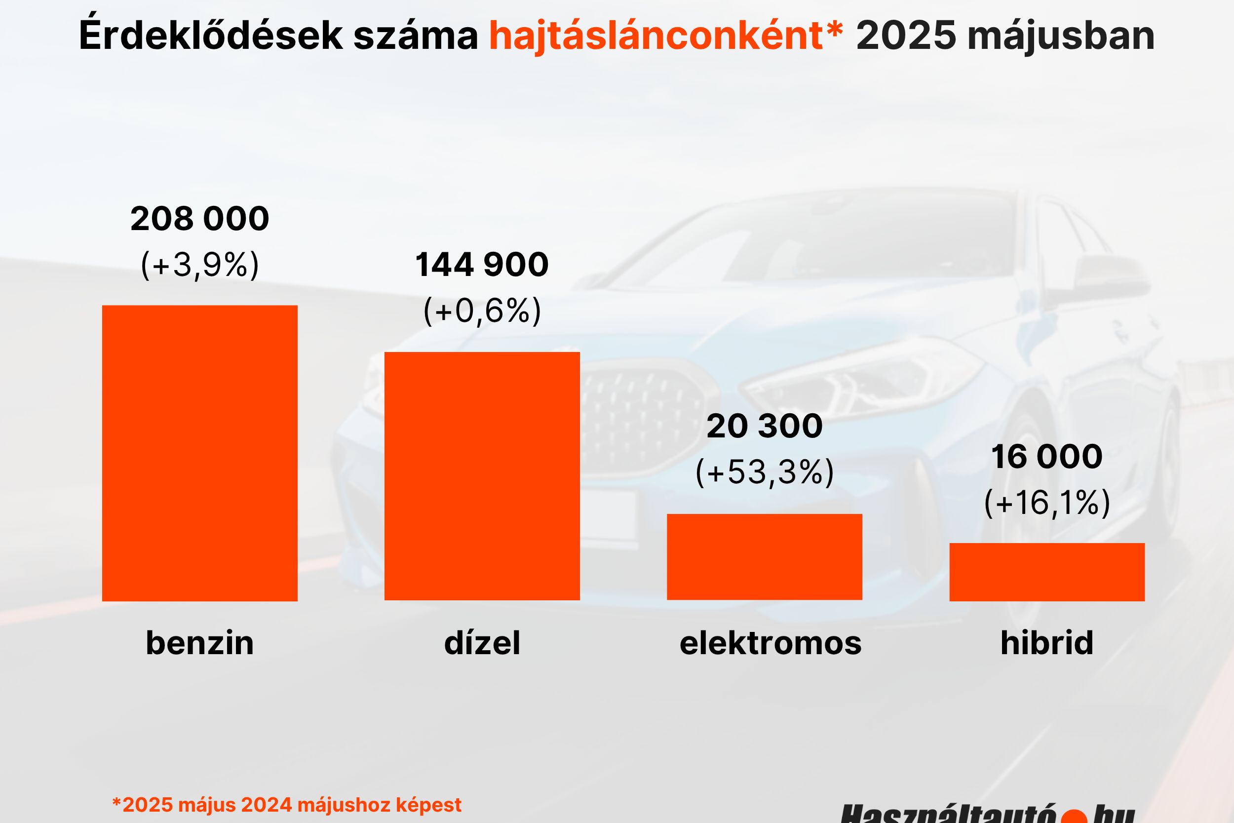 „Tavalyhoz képest jelentős növekedésnek indult a használtautó-piac, főleg az alternatív hajtásláncok körében. Az elektromos autók iránti érdeklődések száma 53,3%-os, míg a hibrid hajtáslánc 16,1%-os emelkedést mutat. Az átlagárak is növekedtek tavaly azonos időszakhoz képest, kivéve az elektromos autók esetében, és az átlagéletkor is, viszont csak minimálisan– tette hozzá Koralewsky Márk, a Használtautó.hu üzletágvezetője.
