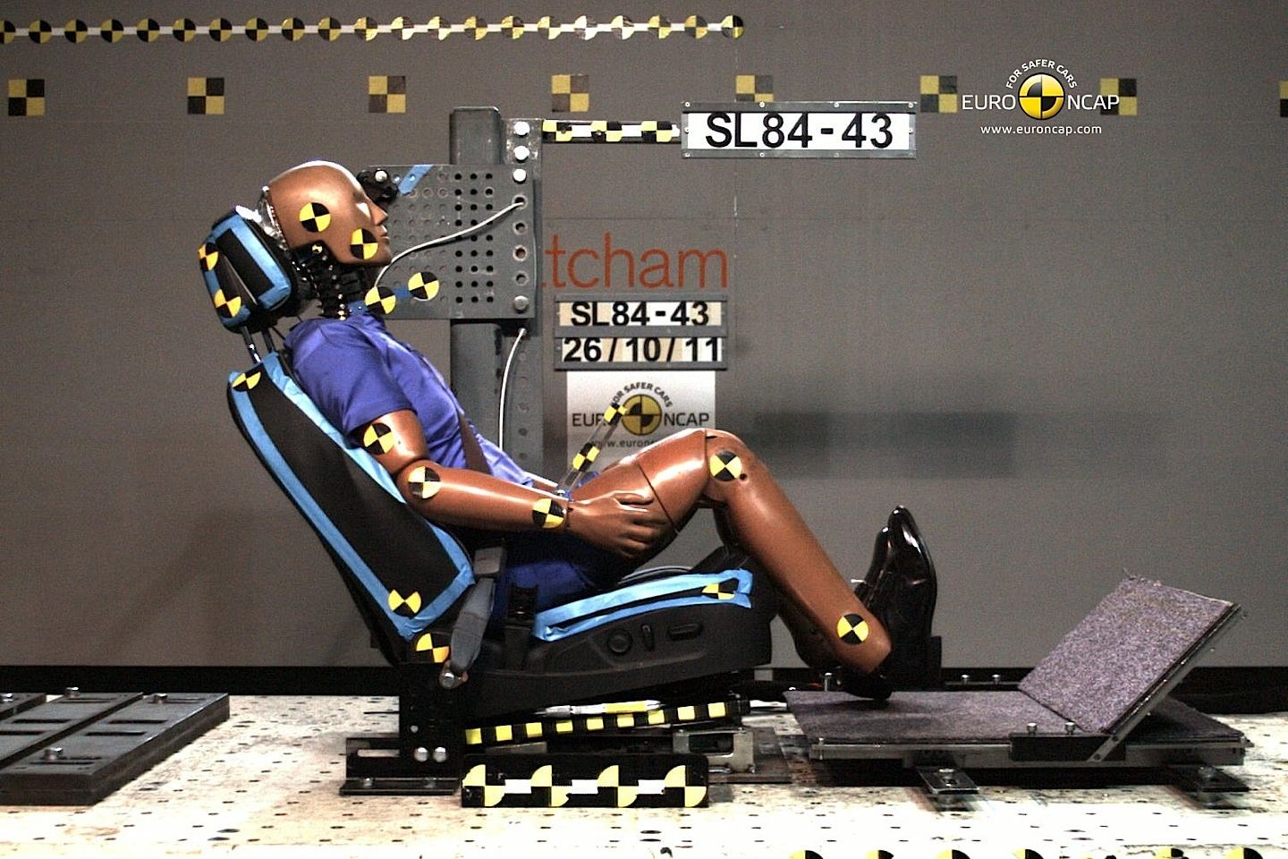 - Ostorszíj-effektus – Hirtelen, hátulról érkező, alacsony sebességű becsapódáskor a leggyakoribb sérülés a nyaktörés. Ezt hivatott szimulálni az ostorszíj teszt. Itt már mindössze az ülések és a fejtámaszok viselkedését figyelik. Három dinamikus tesztet végeznek, különböző fejtámasz-állásokban.