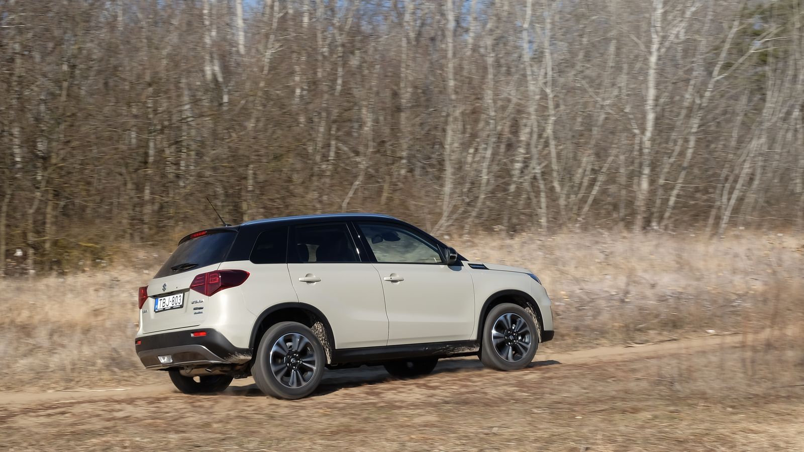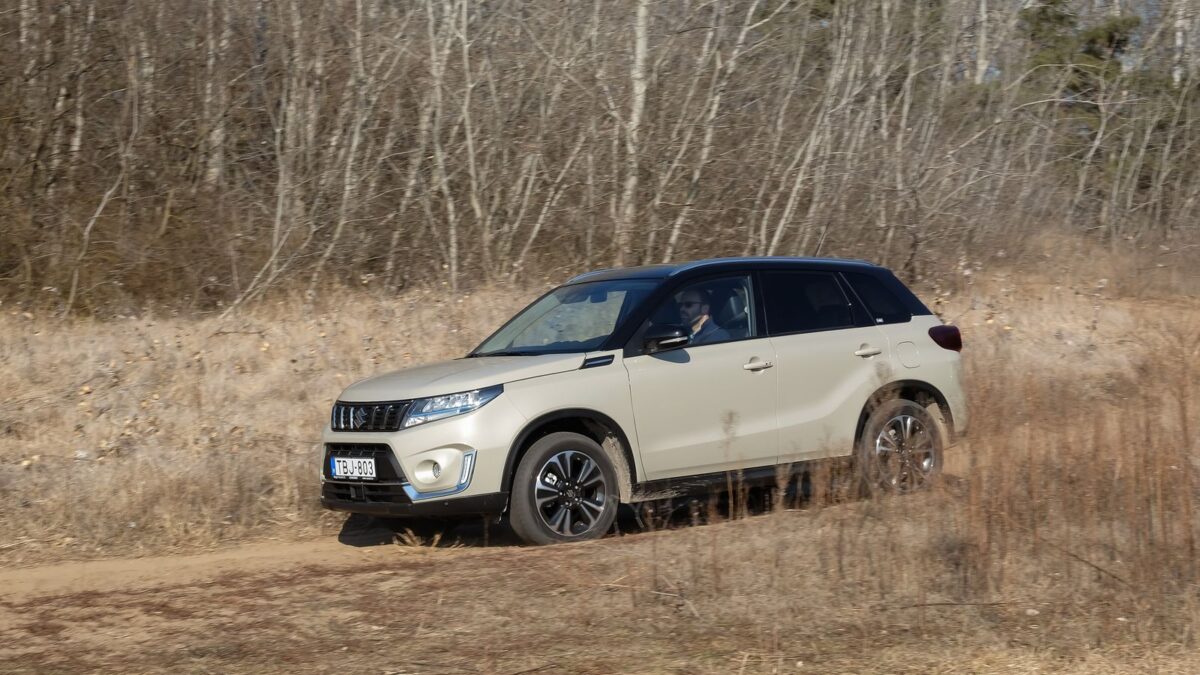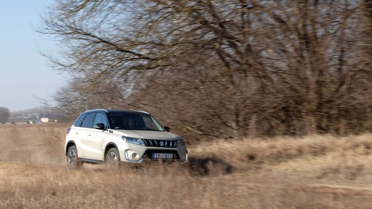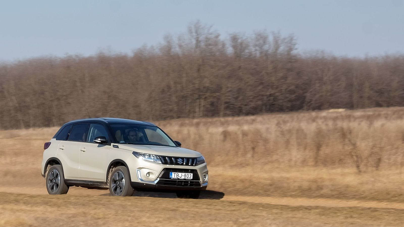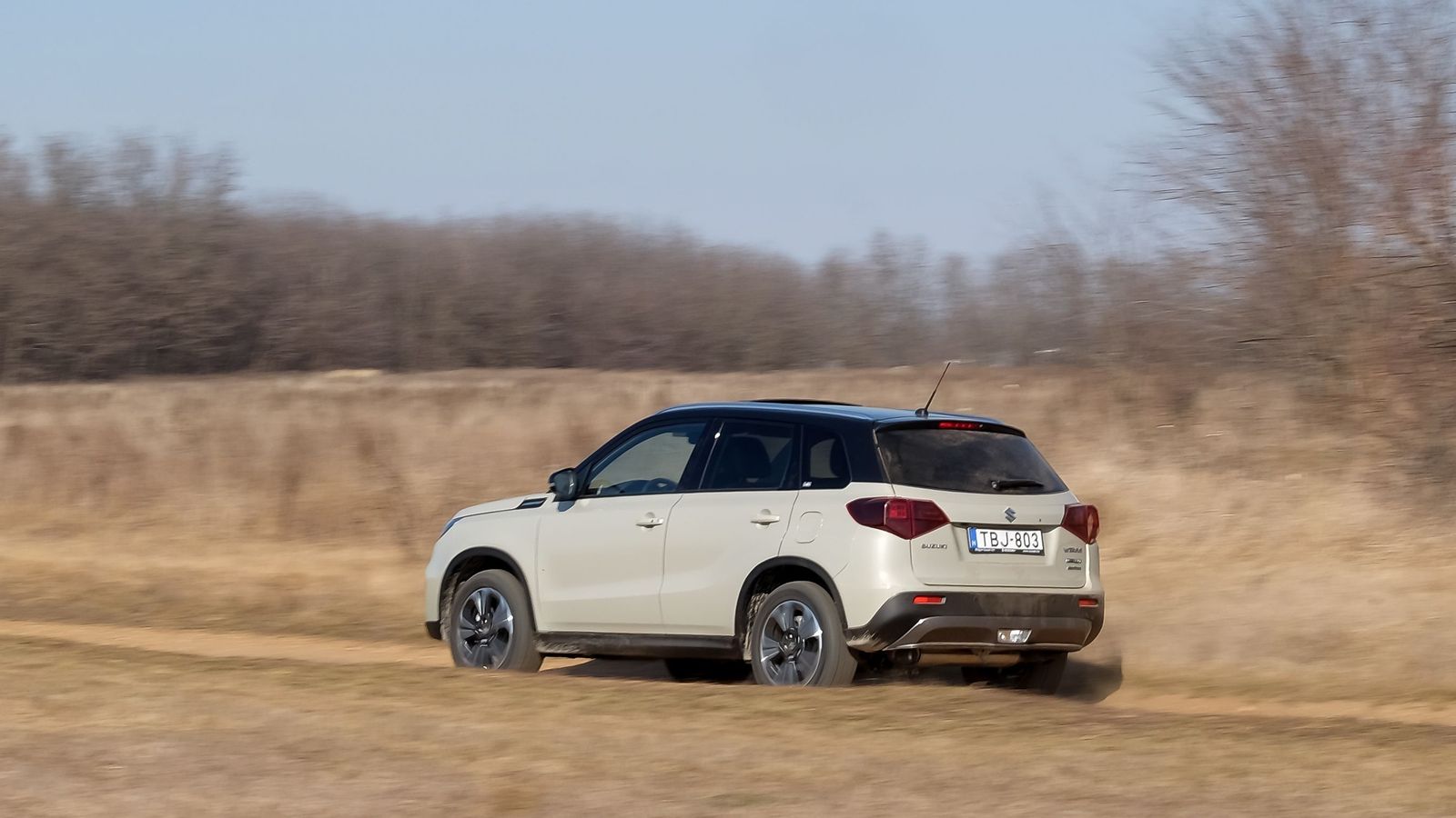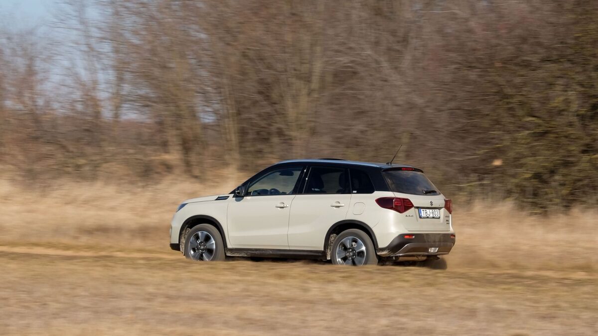 Városi és országúti tempónál benzint égetve is halk a Vitara, mindaddig, amíg nem jön emelkedő. Hiába nem CVT (pontosabban e-CVT) osztóműves, mint legfőbb hibrid vetélytársai, a robotváltó hasonlóképp erősen pakolja vissza a fokozatokat és idéz elő magas motorfordulatot. Elsőre meglepetés, amikor az országúti 90 km/órás tempót hatodik fokozatban kellemes 2200/perces fordulattal tartva egy kisebb emelkedőnél is kettőt visszakapcsol az automatika, majd 4500/perces fordulattal és már érezhető motorhanggal futunk, de legalább továbbra is töretlen dinamikával. Az autópályás 130 km/órás tempónál már hatodikban is túl vagyunk a 3000/perces fordulaton. Ilyenkor is hallható a benzinmotor, de szélzaj is van már. Nekem ez fájóbb volt, mint az aktuális Vitarák közül a leginkább kimért (az összkerekes verziónál 13,5 másodperces) 100-as sprint, de