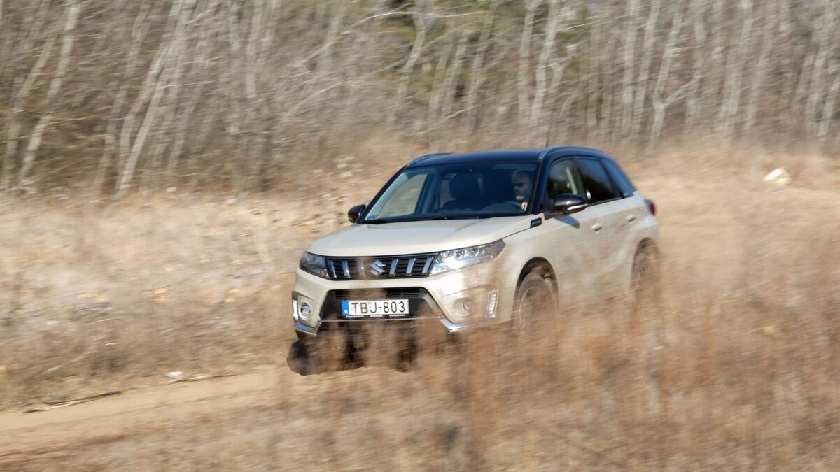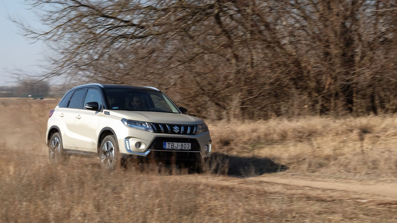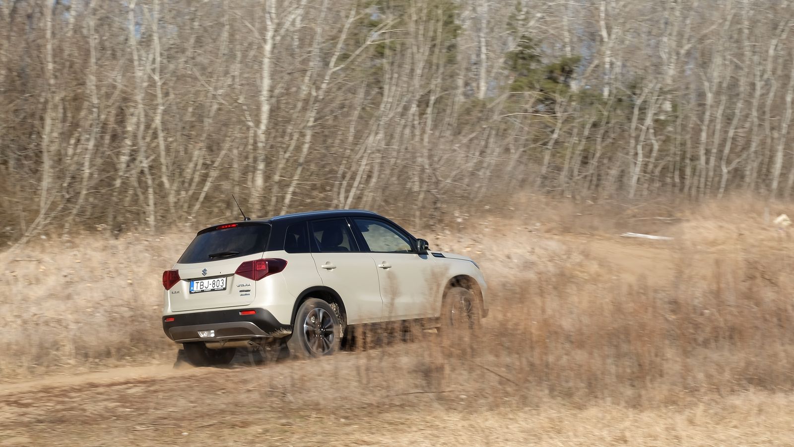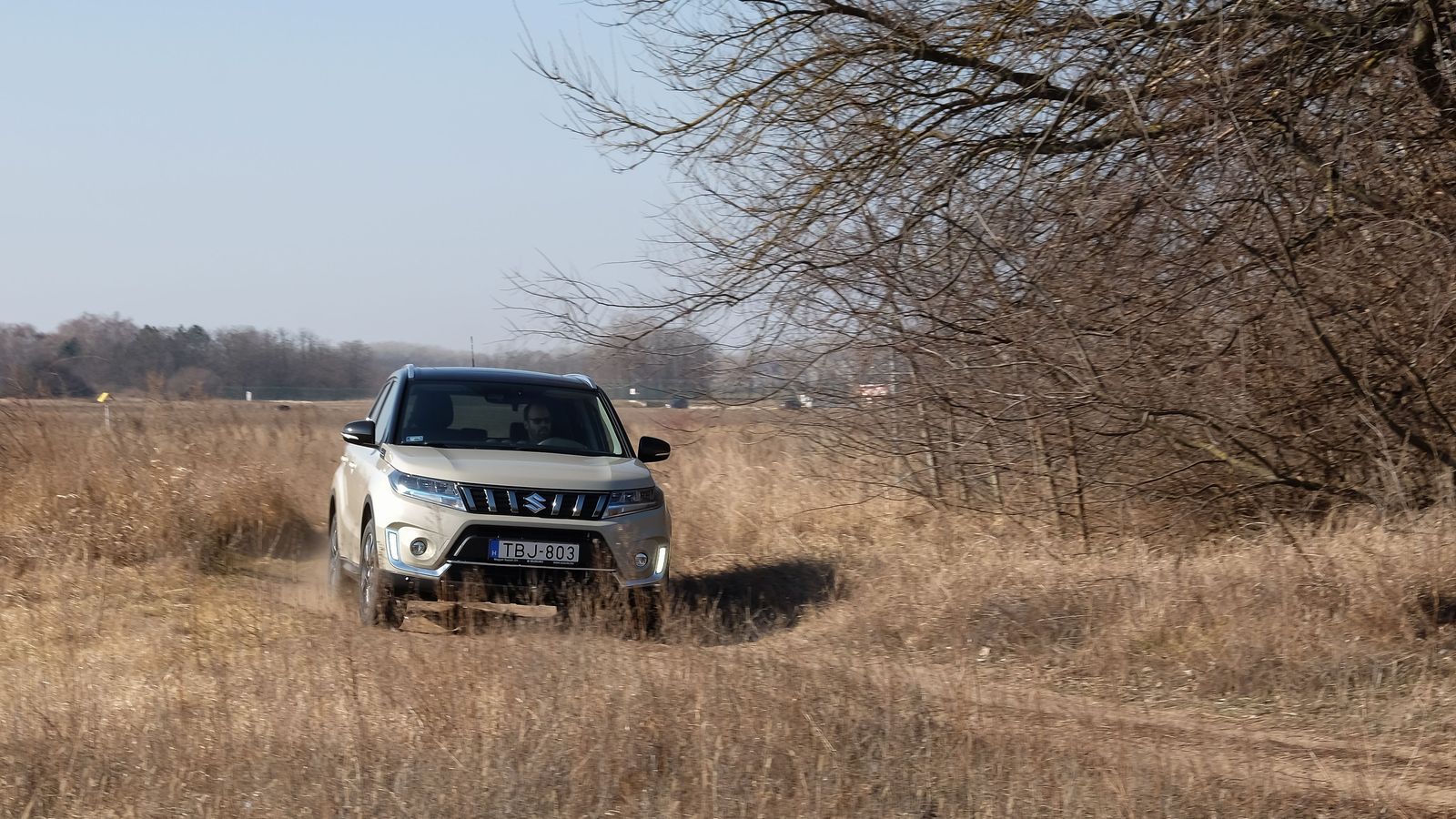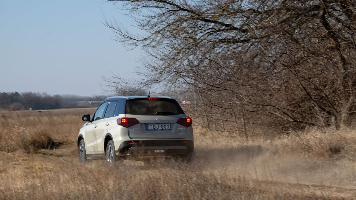 Városi és országúti tempónál benzint égetve is halk a Vitara, mindaddig, amíg nem jön emelkedő. Hiába nem CVT (pontosabban e-CVT) osztóműves, mint legfőbb hibrid vetélytársai, a robotváltó hasonlóképp erősen pakolja vissza a fokozatokat és idéz elő magas motorfordulatot. Elsőre meglepetés, amikor az országúti 90 km/órás tempót hatodik fokozatban kellemes 2200/perces fordulattal tartva egy kisebb emelkedőnél is kettőt visszakapcsol az automatika, majd 4500/perces fordulattal és már érezhető motorhanggal futunk, de legalább továbbra is töretlen dinamikával. Az autópályás 130 km/órás tempónál már hatodikban is túl vagyunk a 3000/perces fordulaton. Ilyenkor is hallható a benzinmotor, de szélzaj is van már. Nekem ez fájóbb volt, mint az aktuális Vitarák közül a leginkább kimért (az összkerekes verziónál 13,5 másodperces) 100-as sprint, de