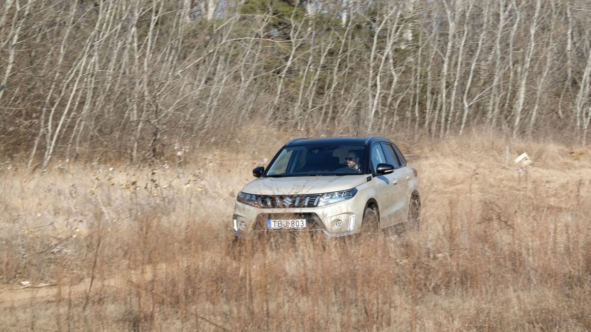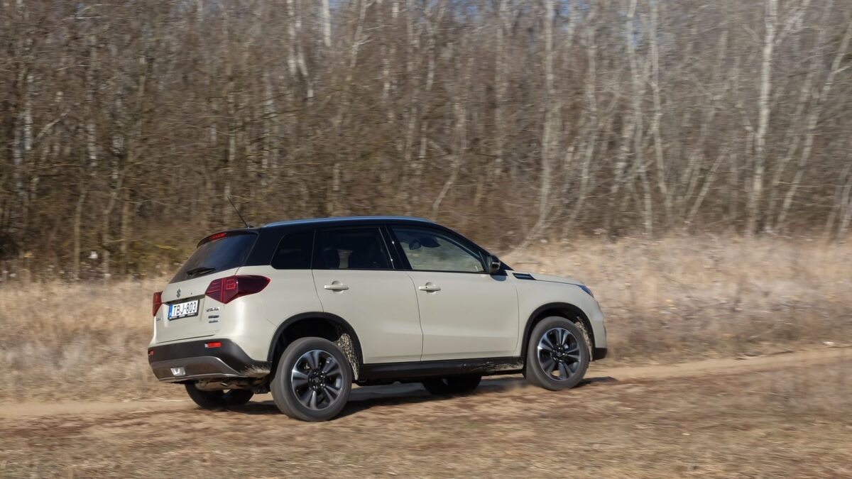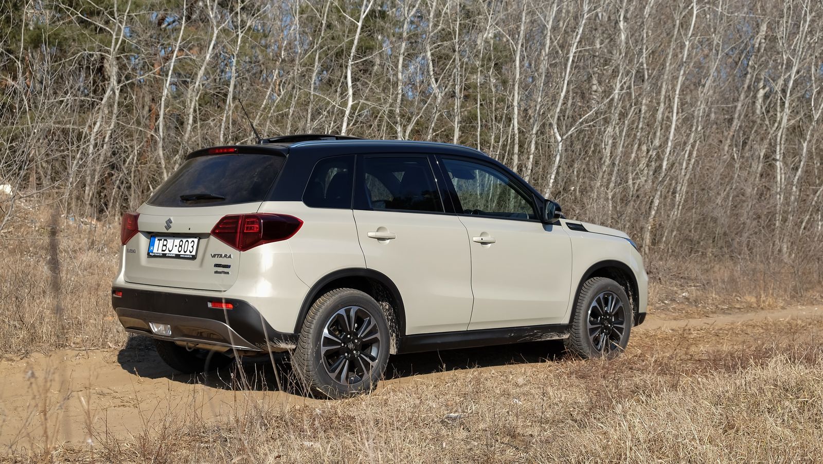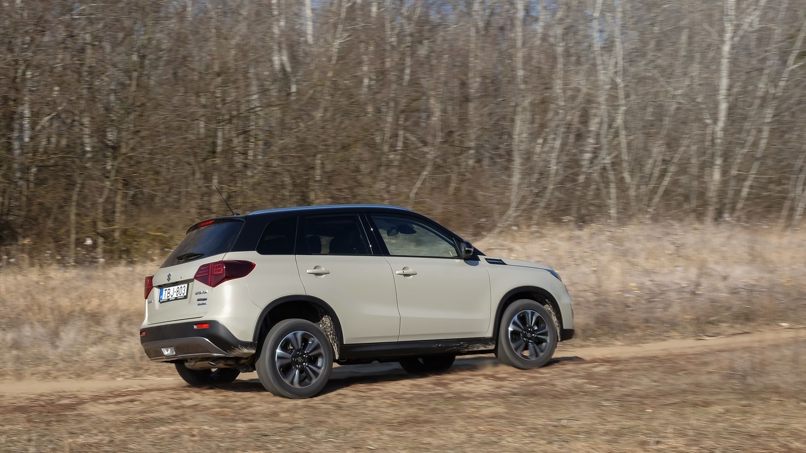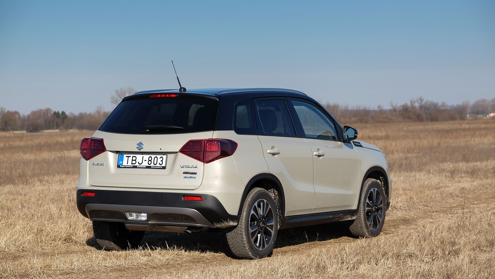 Városi és országúti tempónál benzint égetve is halk a Vitara, mindaddig, amíg nem jön emelkedő. Hiába nem CVT (pontosabban e-CVT) osztóműves, mint legfőbb hibrid vetélytársai, a robotváltó hasonlóképp erősen pakolja vissza a fokozatokat és idéz elő magas motorfordulatot. Elsőre meglepetés, amikor az országúti 90 km/órás tempót hatodik fokozatban kellemes 2200/perces fordulattal tartva egy kisebb emelkedőnél is kettőt visszakapcsol az automatika, majd 4500/perces fordulattal és már érezhető motorhanggal futunk, de legalább továbbra is töretlen dinamikával. Az autópályás 130 km/órás tempónál már hatodikban is túl vagyunk a 3000/perces fordulaton. Ilyenkor is hallható a benzinmotor, de szélzaj is van már. Nekem ez fájóbb volt, mint az aktuális Vitarák közül a leginkább kimért (az összkerekes verziónál 13,5 másodperces) 100-as sprint, de