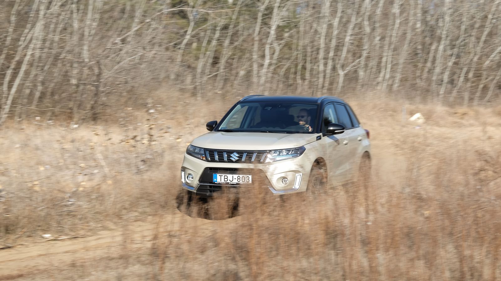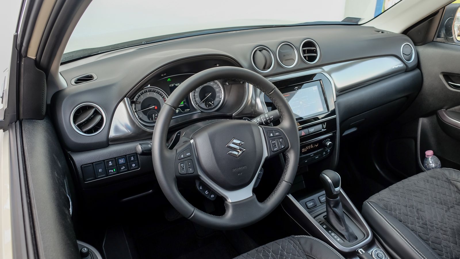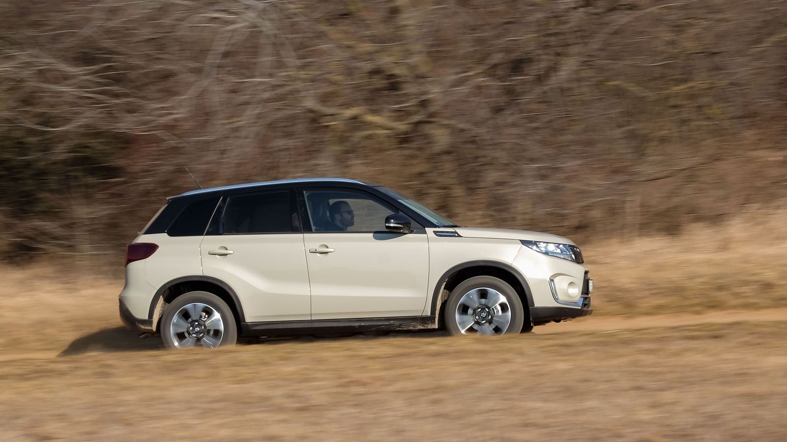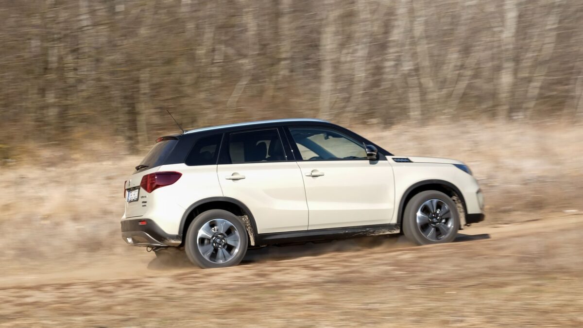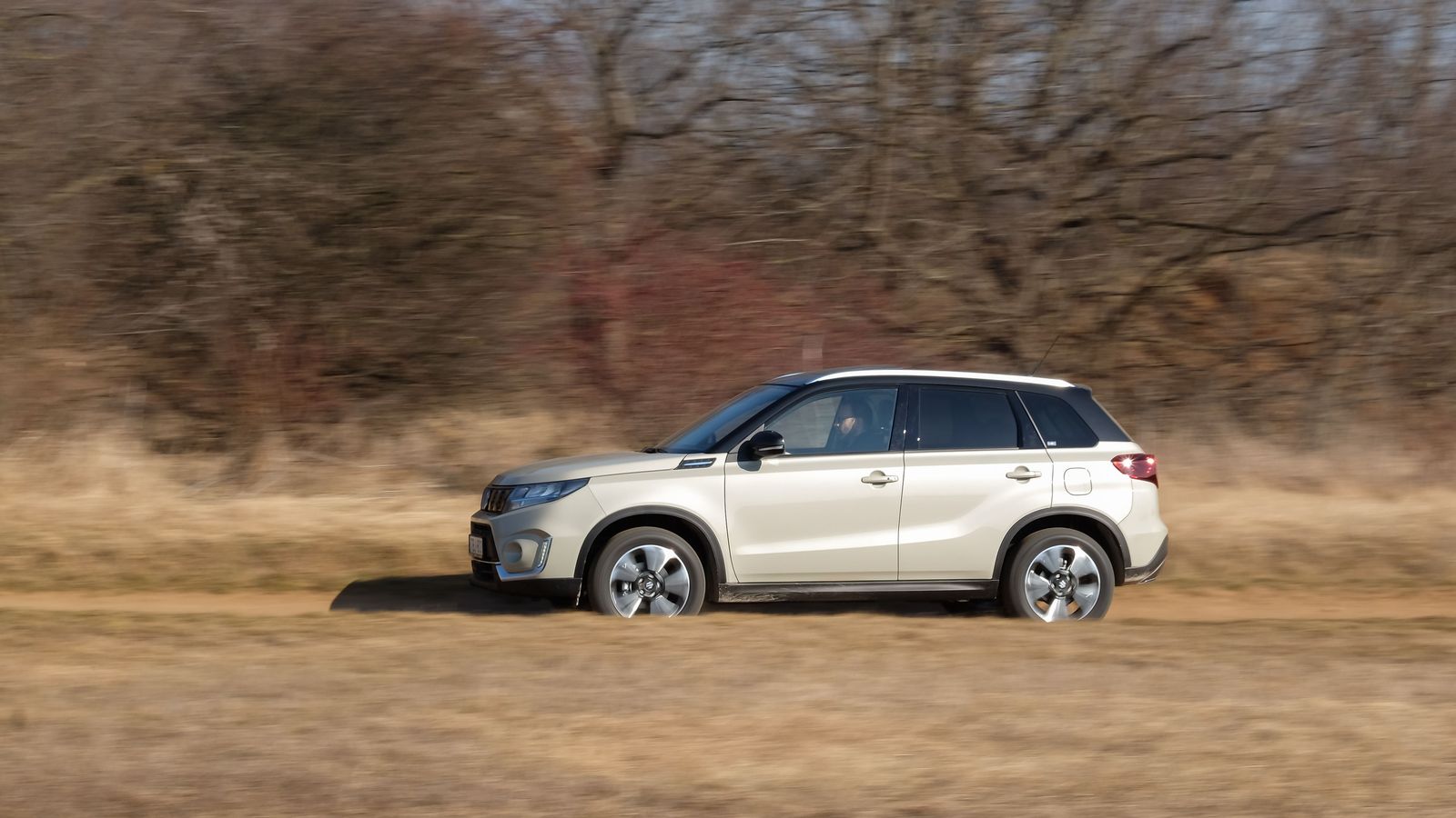 Városi és országúti tempónál benzint égetve is halk a Vitara, mindaddig, amíg nem jön emelkedő. Hiába nem CVT (pontosabban e-CVT) osztóműves, mint legfőbb hibrid vetélytársai, a robotváltó hasonlóképp erősen pakolja vissza a fokozatokat és idéz elő magas motorfordulatot. Elsőre meglepetés, amikor az országúti 90 km/órás tempót hatodik fokozatban kellemes 2200/perces fordulattal tartva egy kisebb emelkedőnél is kettőt visszakapcsol az automatika, majd 4500/perces fordulattal és már érezhető motorhanggal futunk, de legalább továbbra is töretlen dinamikával. Az autópályás 130 km/órás tempónál már hatodikban is túl vagyunk a 3000/perces fordulaton. Ilyenkor is hallható a benzinmotor, de szélzaj is van már. Nekem ez fájóbb volt, mint az aktuális Vitarák közül a leginkább kimért (az összkerekes verziónál 13,5 másodperces) 100-as sprint, de