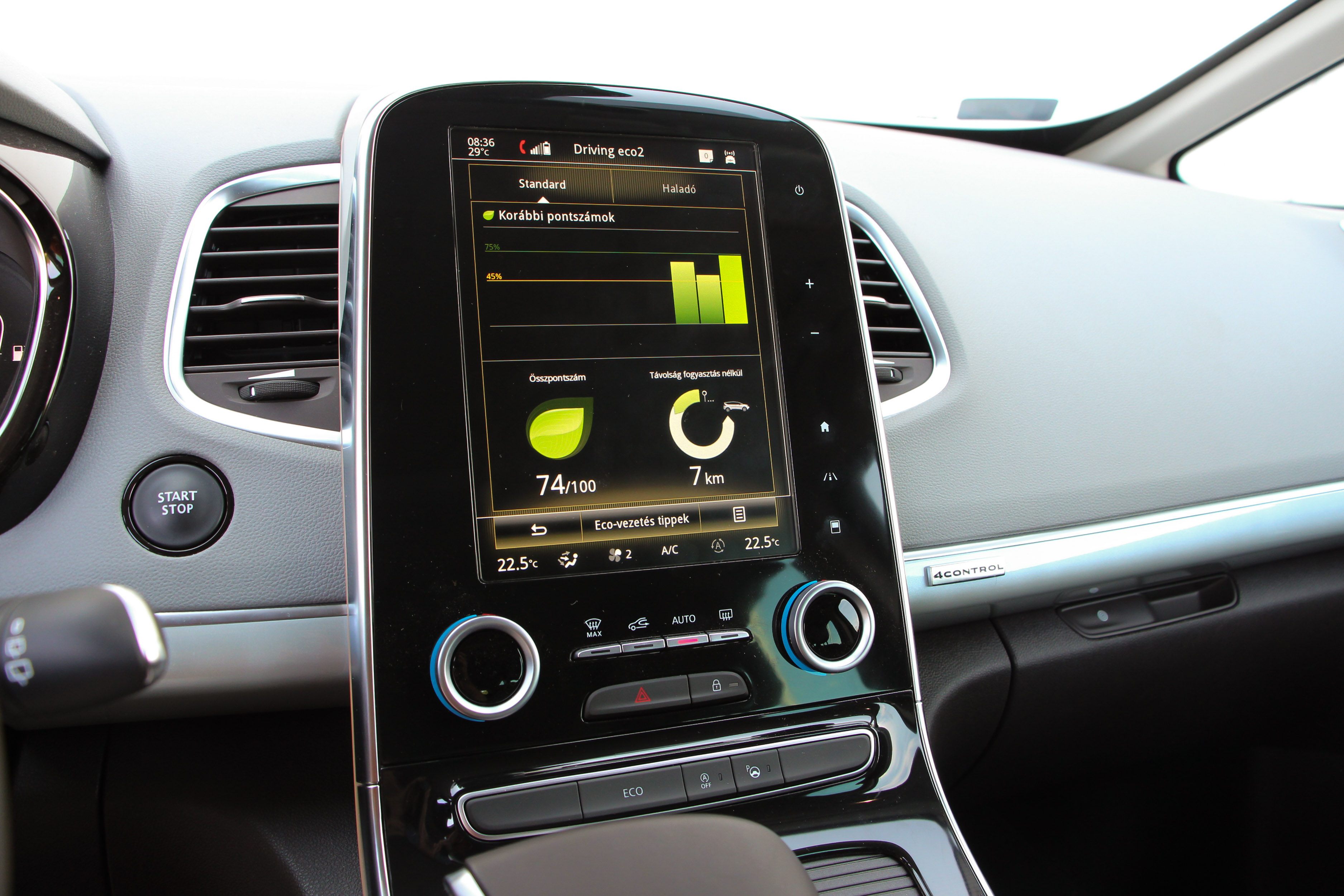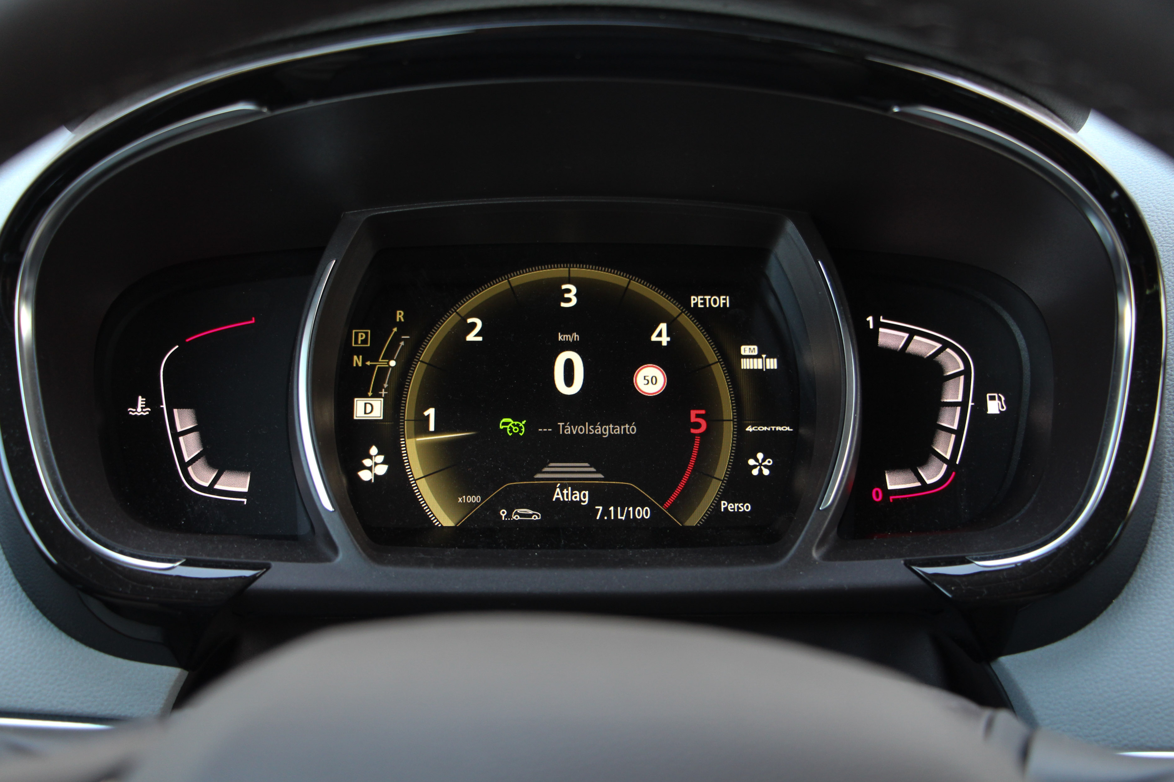 Mindenki tud, mindent? Aki a benzines Espace tesztjét olvasta, az a fenti két bekezdés után vélhetően már nem fog sok újdonságot olvasni, de azért persze mégis, mert a két tesztautó nemcsak motorjával, hanem felszereltségével is különbözött, s a dízelnek természetesen a váltója is más, hiszen a hétfokozatú duplakuplungos kizárólag a benzineshez jár. Az ikerturbós gázolajos szintén kétkuplungos, de csak hatfokozatú egységet kap. A gyakorlatban a kevesebb fokozat az egyes és a kettes közötti nagyobb lépcsőből vehető csak észre (így az egyest egy kicsit sokáig húzatja az elektronika), amúgy ennek is kellően hosszú az áttételezése, az autópályás 130 km/órás tempó alig több mint 2200 1/perc fordulaton futható. A kapcsolások érezhetőek, nem elég gyorsak, a lejtőt, emelkedőt viszont kellően felismeri az automatika. Bár a kézi kapcsolás lehetősége megvan, nemigen kell kézzel beavatkozni. Az elektronikus váltókar alól kapcsolható Multi Sense rendszer természetesen a váltóra is kihat, mellette a motorvezérlés, a lengéscsillapítás, a kormányrásegítés és az összkerékkormányzás paraméterezését (előre beállított sémák szerint) függetlenül is konfigurálhatjuk.