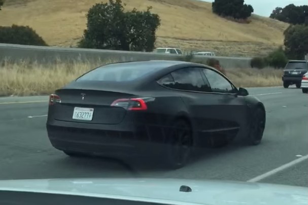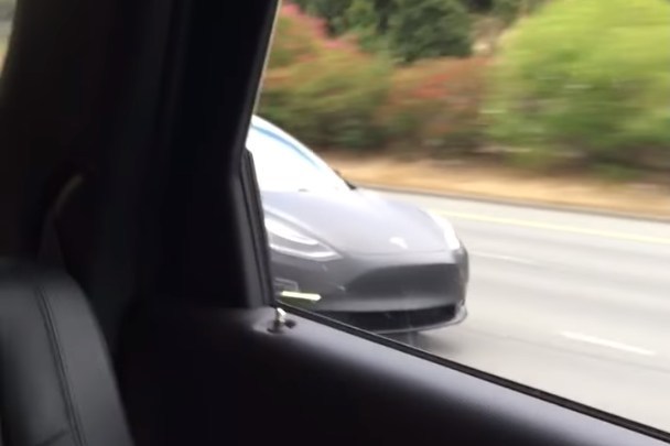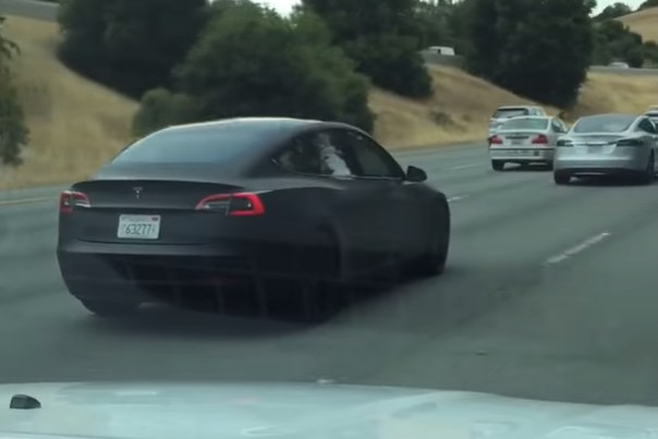 Két Model S között haladt a Model 3, messziről is egyértelmű a különbség, nem lehetett nehéz kiszúrni a konvojt
