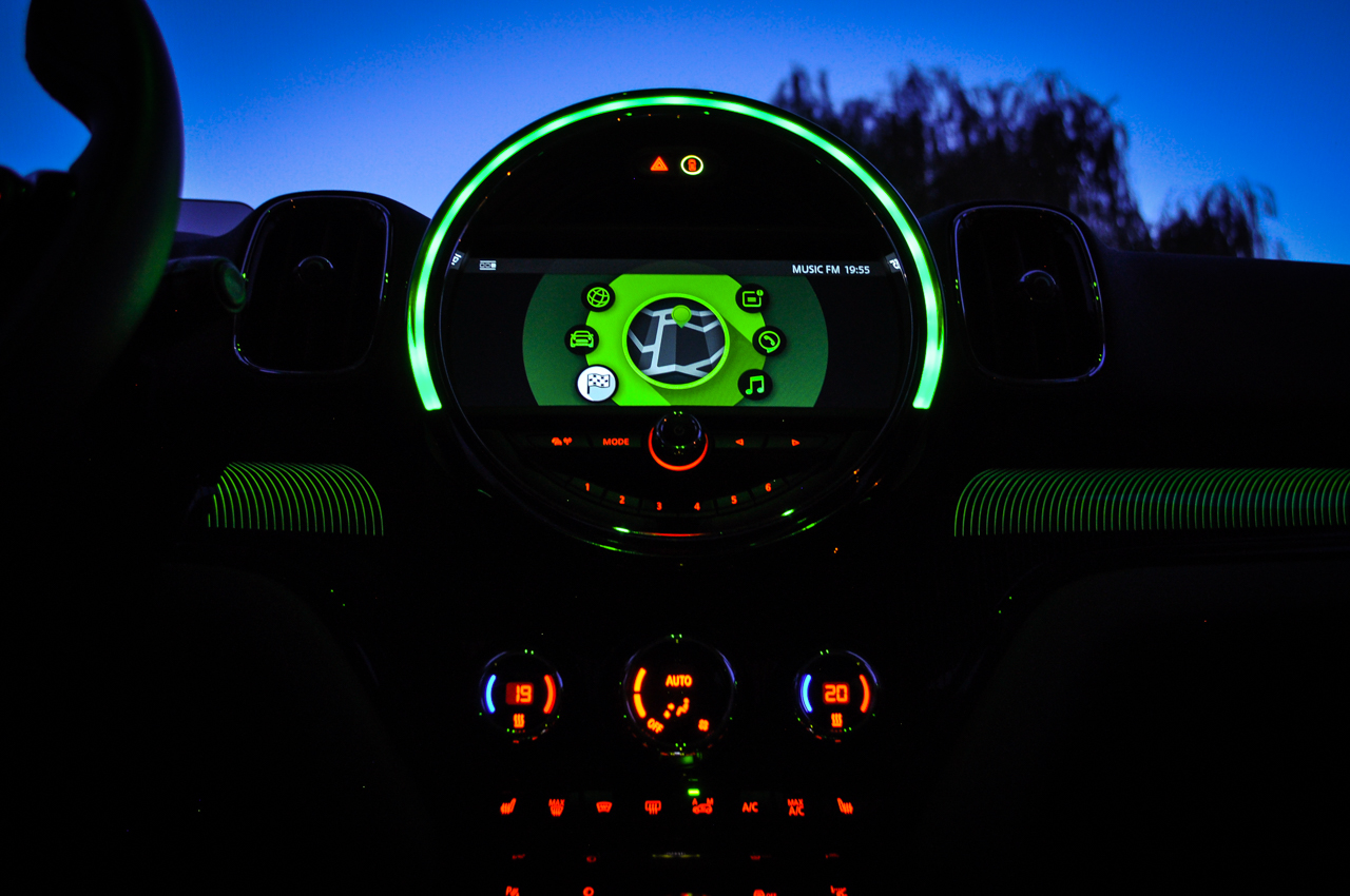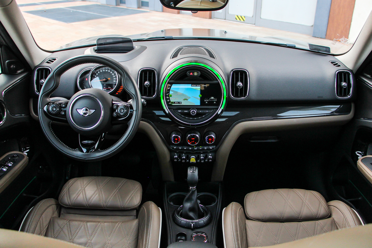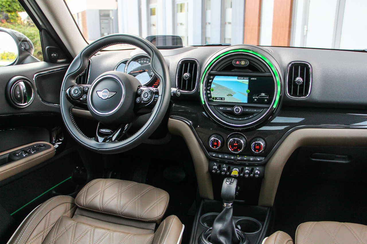 Ezüst külső ide vagy oda, az apró színes részleteknek köszönhetően mégsem tűnik élettelennek. Az utastérben ugyanezt a sárgászöldet örököli egyébként az indítógomb és annak pulzáló világítása, hangulatvilágításnak naná, hogy zöldet választottak. Amiért mégis mindenki felfigyel rá a csillogó szemű hölgyektől, férfitársaimig, az a zöld rendszám, aminek minden előnyét élvezhetjük a plug-in Countrymannel, köztük az egyelőre ingyenes belvárosi parkolást is. Persze ára van a tökéletességre törekvésnek, a legtakarékosabbnak és legtisztábbnak ígérkező Mini csomagtere 45 literrel kisebb, a hátsó fejtér pedig 3 centivel csorbult, hiszen a 7,6 kWh-ás lítiumion akkumulátorcsomag a hátsó ülések és félig a csomagtér alatt kapott helyet. Ezáltal egyébként a csomagtér padlója is görbült, már nem sík, ráadásul 130 kilóval nehezebb a plug-in hibrid, mint a villanymotor nélküli, 2,0 literes, négyhengeres motorral szerelt S ALL4. A menetdinamikán ez kevésbé látszik, ellenben a hatótávon elég komolyan.