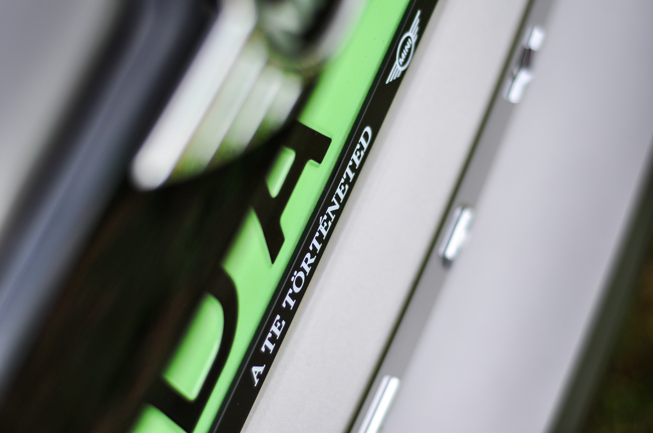 Sárgászöld jelvények és a zöld rendszám is színesítette az alapvetően szürke tesztautót