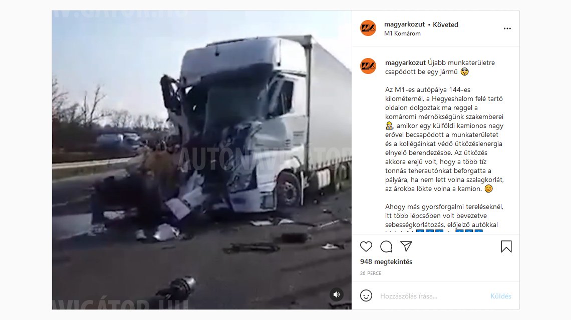 [BANNER type="1"] Most pedig itt egy újabb, ma reggeli eset. Miként az a Magyar Közút közleményében olvasható, az M1-es autópálya 144-es kilométernél, a Hegyeshalom felé tartó oldalon dolgoztak ma reggel a komáromi mérnökség szakemberei, amikor egy külföldi kamionos nagy erővel becsapódott a munkaterületet és az ott dolgozókat védő ütközésienergia elnyelő berendezésbe.