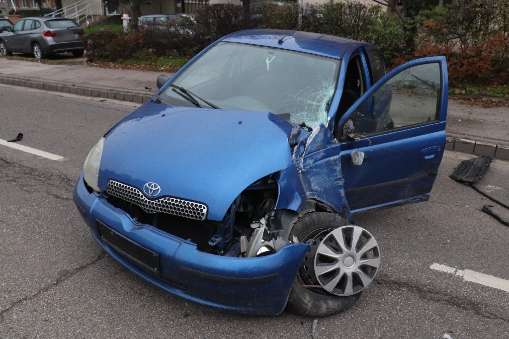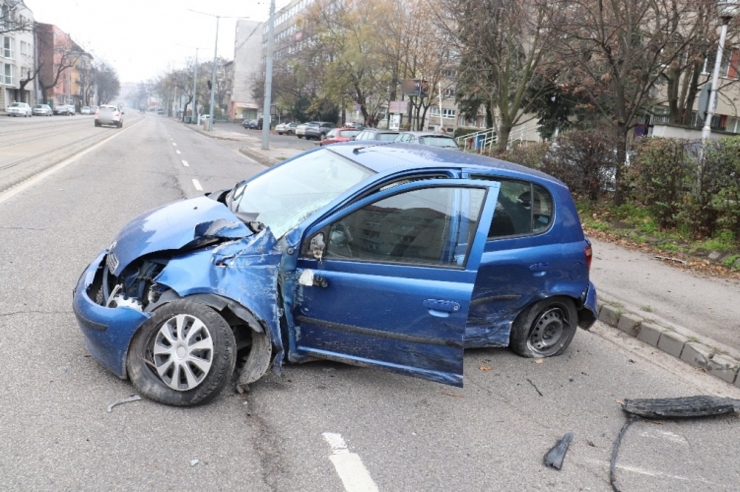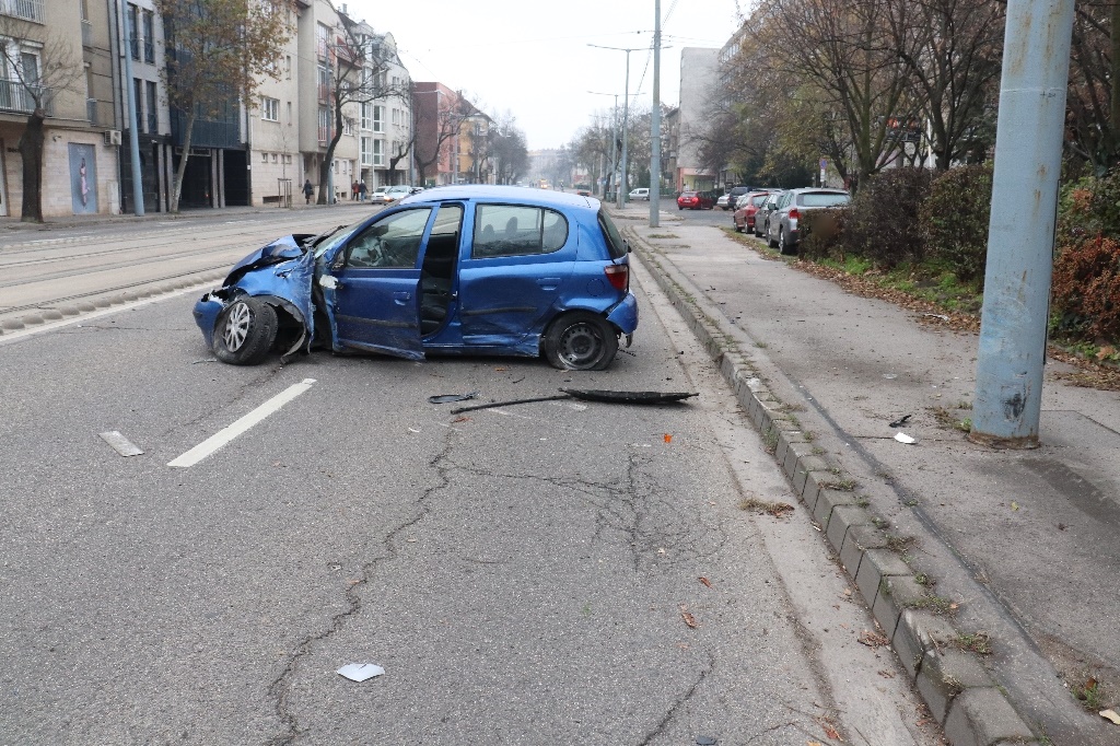 Totálkárosra tört Toyota Yaris egy óbudai kereszteződésben: aligha tudott volna több szabálytalanságot elkövetni a sofőrje (Fotó: Police.hu)