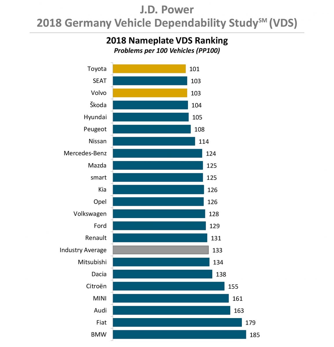 A tanulmány szerint a Toyota típusaival van a legkevesebb probléma: 100 járműre átlagosan 101 meghibásodás jut. Ezzel nemcsak a tömegpiaci márkák között, hanem a teljes piacon az abszolút legmegbízhatóbb márkának bizonyult; a piaci átlag ugyanis 133 hibapont/100 jármű volt. 103 hibaponttal lett második és harmadik a SEAT és a Volvo, a Skoda 104-gyel a negyedik, a top 10-be (sorrendben) még a Hyundai, Peugeot, Nissan, Mercedes-Benz, Mazda és smart márkák fértek be. A lista utolsója a BMW, őt a Fiat és az Audi előzi.